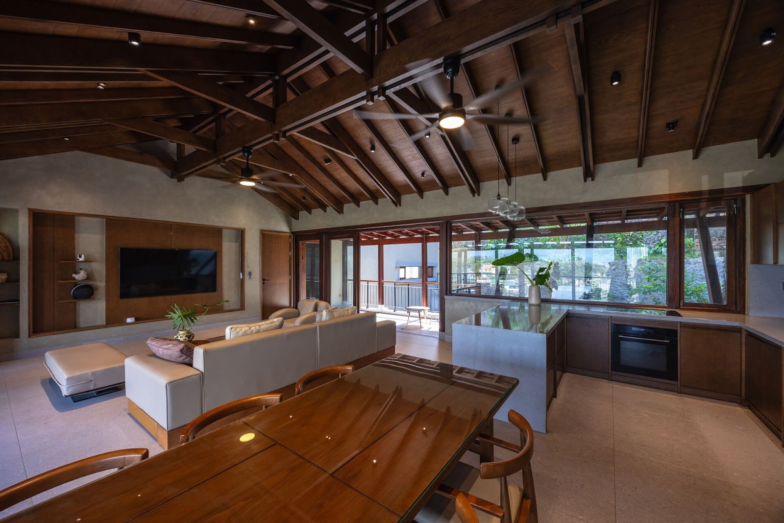 Phòng khách và bếp liên thông trong không gian trần cao, phô bày hệ xà gỗ đẹp mắt. Nội thất tông nâu – be tối giản tôn lên vẻ ấm cúng và sang trọng của ngôi nhà.