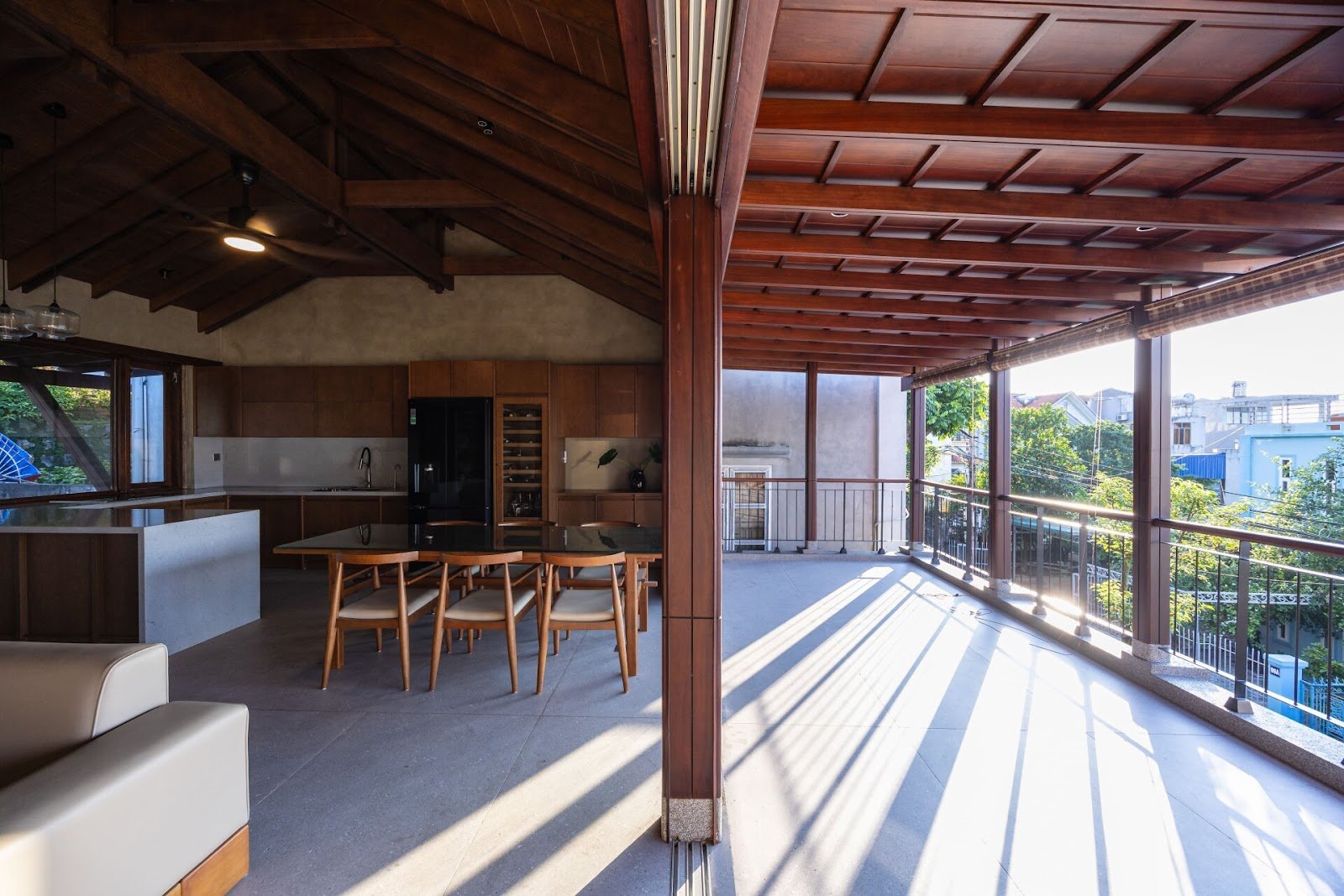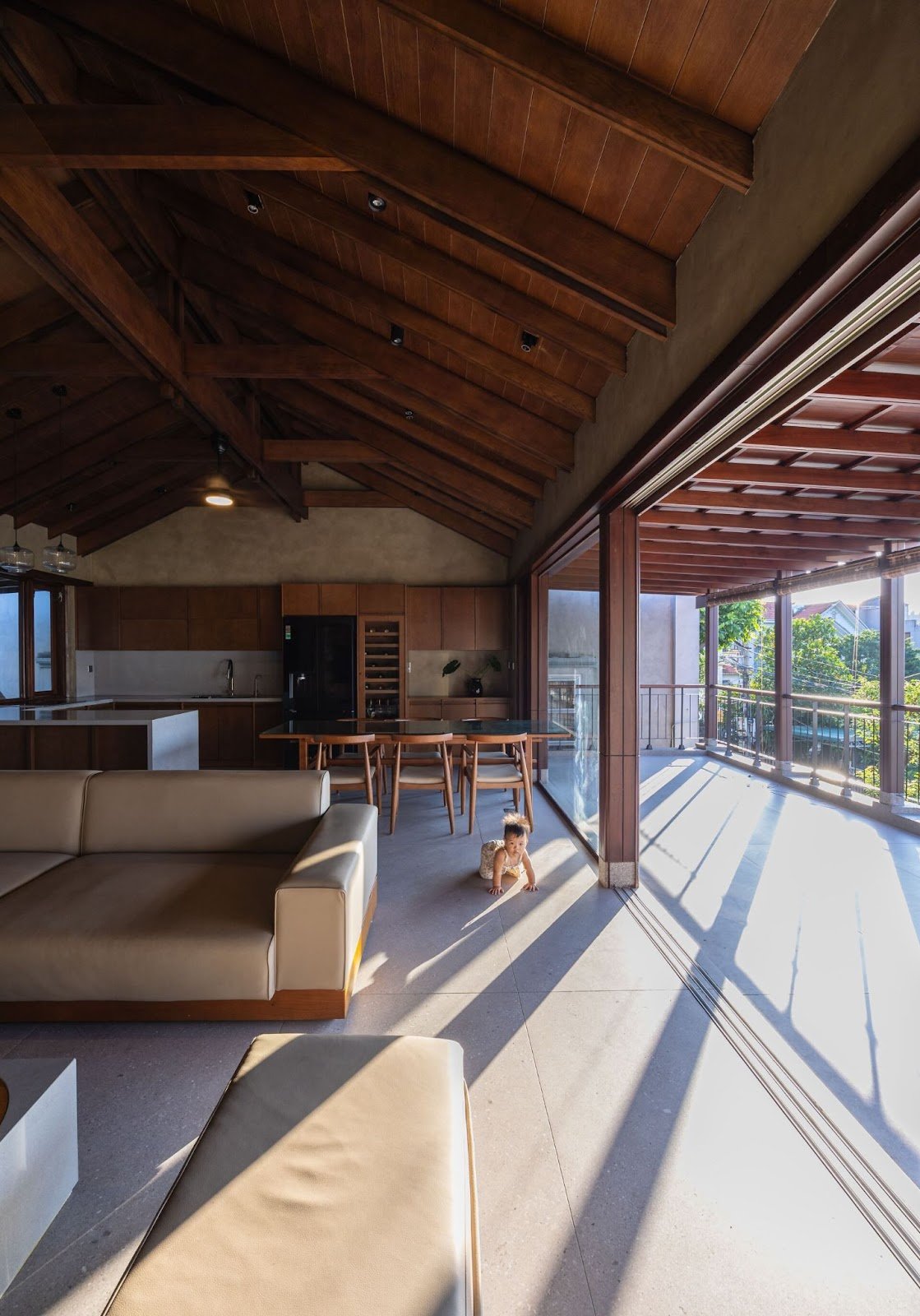 Không gian sinh hoạt chung trên tầng hai mở rộng ra ban công lớn, đón nắng và gió. Hệ kết cấu gỗ và cửa kính trượt giúp xóa nhòa ranh giới giữa trong và ngoài nhà.