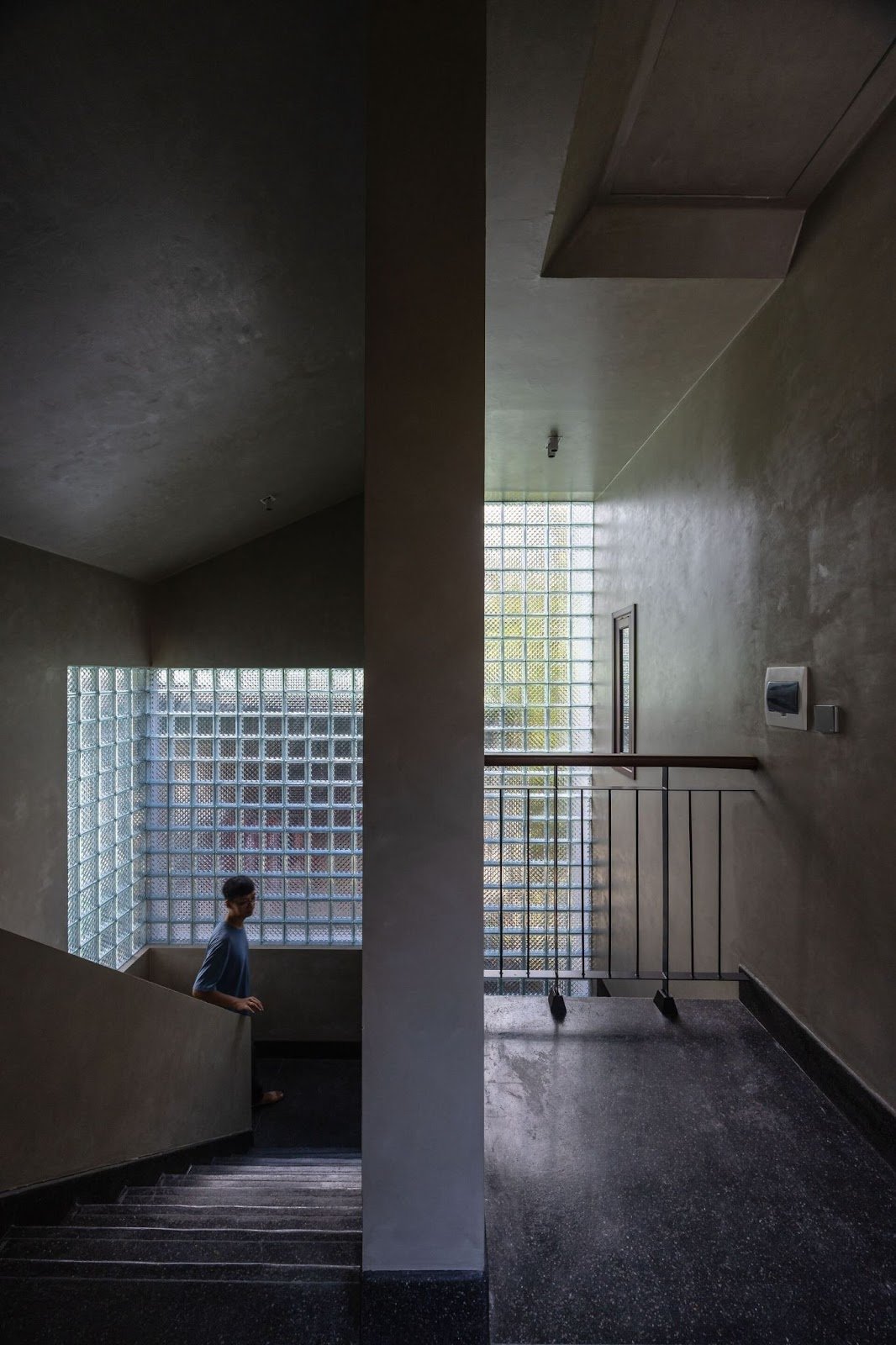 Cầu thang lấy sáng bằng gạch kính trong suốt, giúp khu vực giao thông đứng giữa nhà vẫn tràn ngập ánh sáng tự nhiên. Các bề mặt xi măng mộc phối cùng ánh sáng nhẹ tạo nên khung cảnh tĩnh lặng.