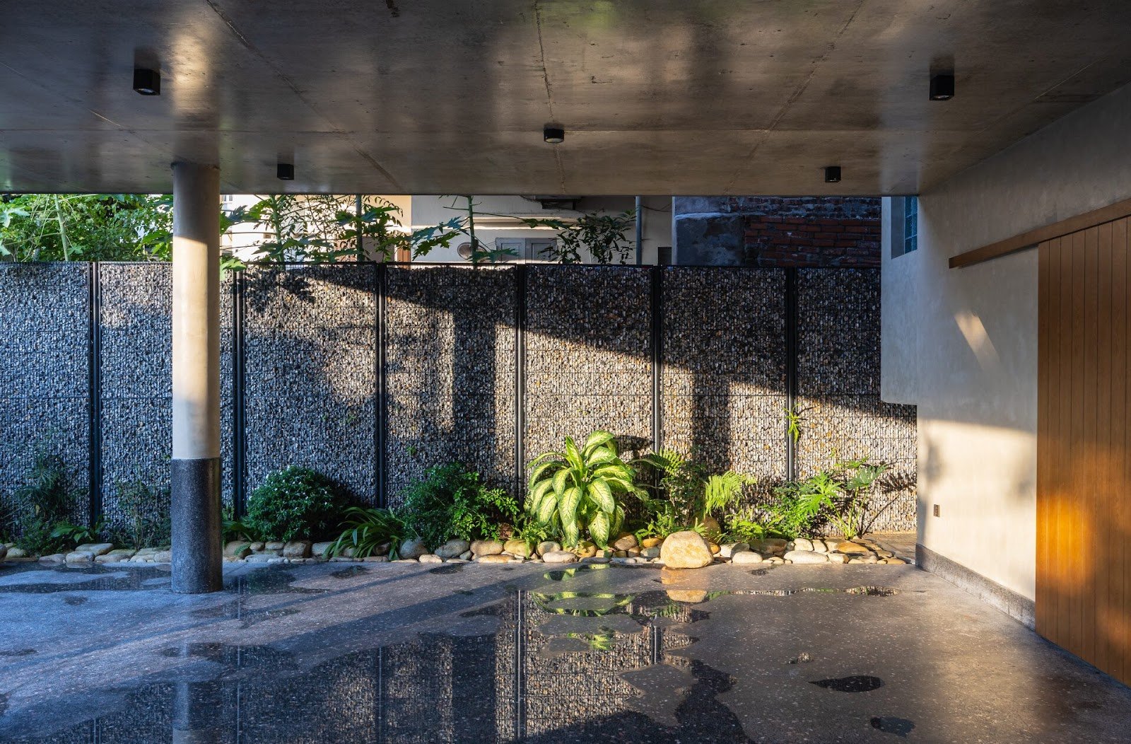 Khoảng sân đa chức năng của Ba House phủ bóng mát từ tầng trên, được bao quanh bởi tường rọ đá và mảng xanh mướt, mang lại cảm giác an yên giữa đô thị. Ánh nắng chiều phản chiếu trên nền đá mài khiến không gian thêm ấm áp và gần gũi.