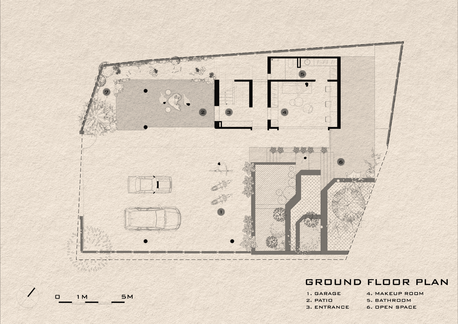 Bản vẽ mặt bằng tầng trệt Ba House thể hiện bố cục gồm gara, sân trong và khu phòng trang điểm kết nối không gian mở. Khu vườn và sân hiên được bố trí để đón sáng, tạo sự thông thoáng cho toàn bộ khối nhà.