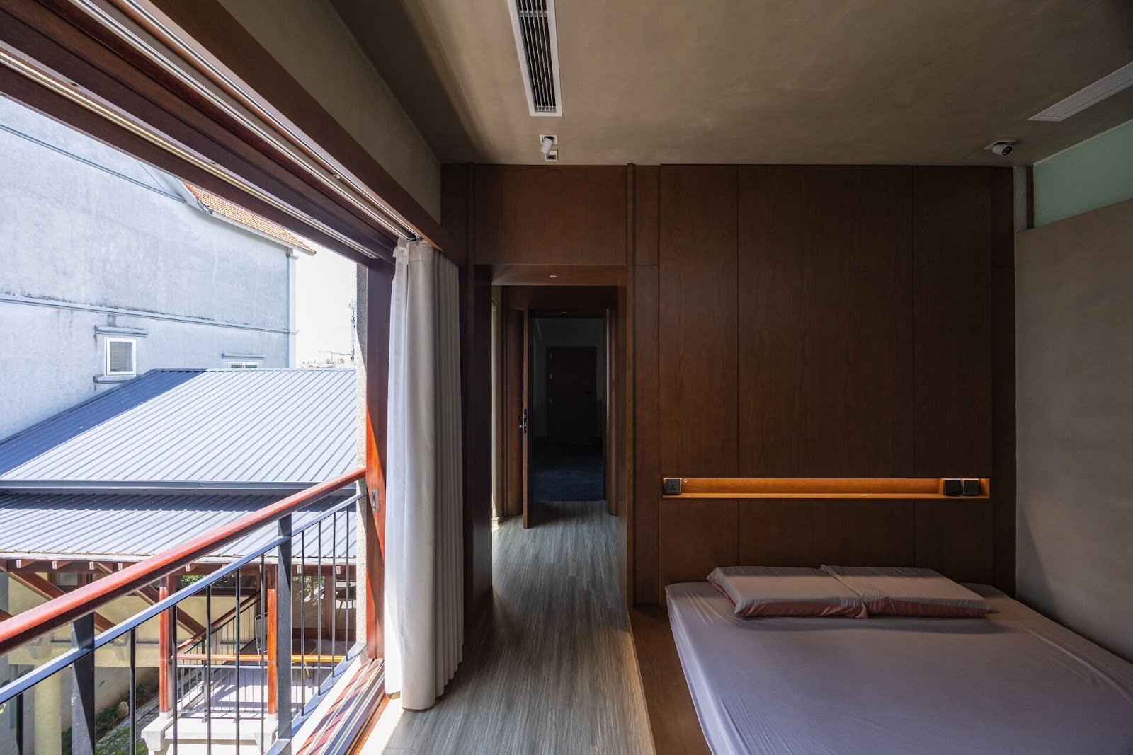 Phòng ngủ với giường thấp, tường ốp gỗ và cửa sổ lớn giúp đón sáng tự nhiên. Từ đây có thể nhìn xuống phần mái nhà và hiên gỗ của tầng dưới, tạo kết nối thị giác xuyên suốt.