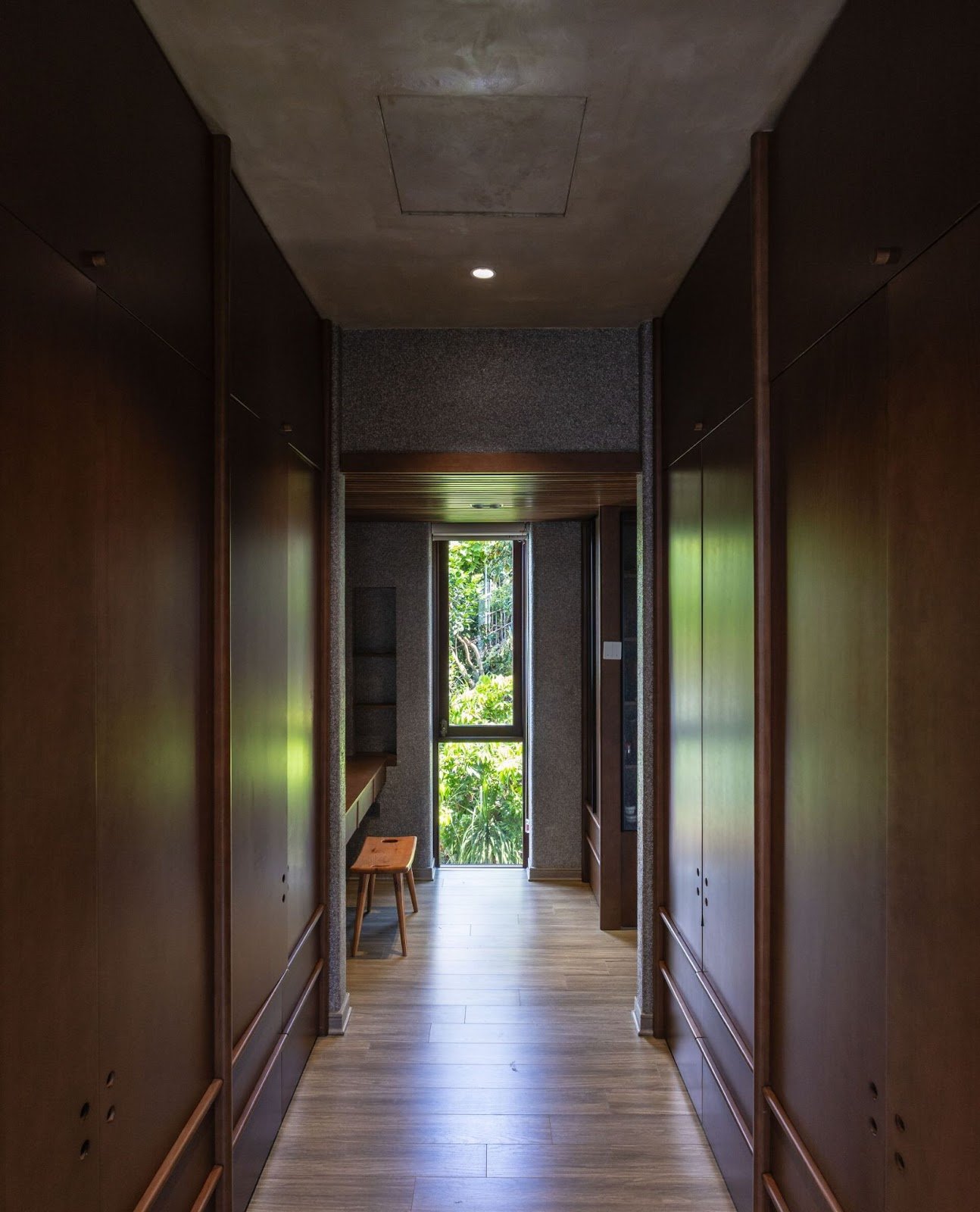 Lối vào tầng trệt với cửa gỗ trượt tối giản và tường xi măng mộc. Cầu thang dẫn lên khu vườn phía sau cho thấy sự kết nối hài hòa giữa không gian kiến trúc và cảnh quan.