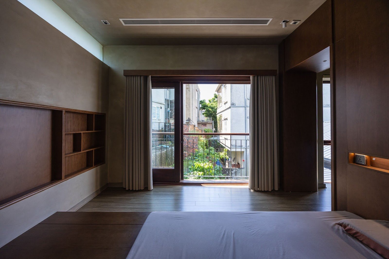 Phòng ngủ chính của Ba House mở ra khung cảnh xanh mát nhờ cửa kính lớn dẫn ra ban công. Thiết kế tối giản, sử dụng tông gỗ và xi măng mộc mang lại cảm giác thư thái, yên tĩnh.