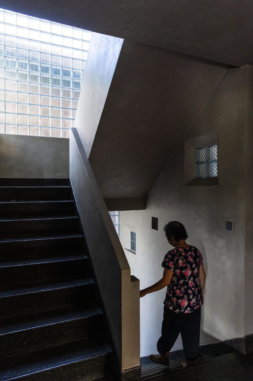 Người bà thong thả bước xuống cầu thang được chiếu sáng bởi các mảng tường gạch kính. Hình ảnh giản dị gợi lên tinh thần kết nối thế hệ – ý nghĩa trung tâm của Ba House.