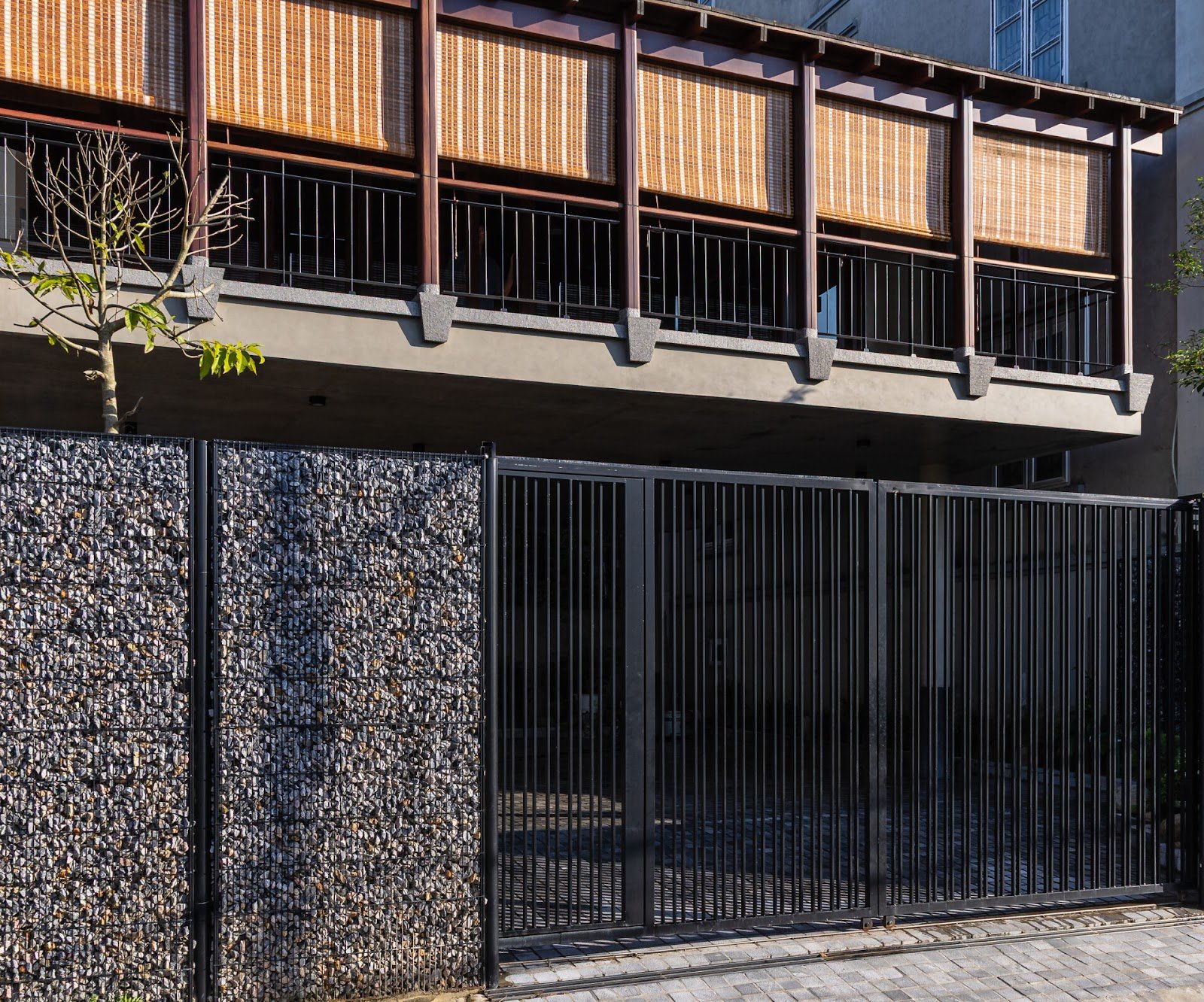 Mặt tiền tầng hai của Ba House với hệ cửa chớp tre và lan can thép đơn giản. Lớp tường rọ đá và cổng đen mang lại cảm giác vững chãi, cân bằng giữa nét mộc mạc và hiện đại.