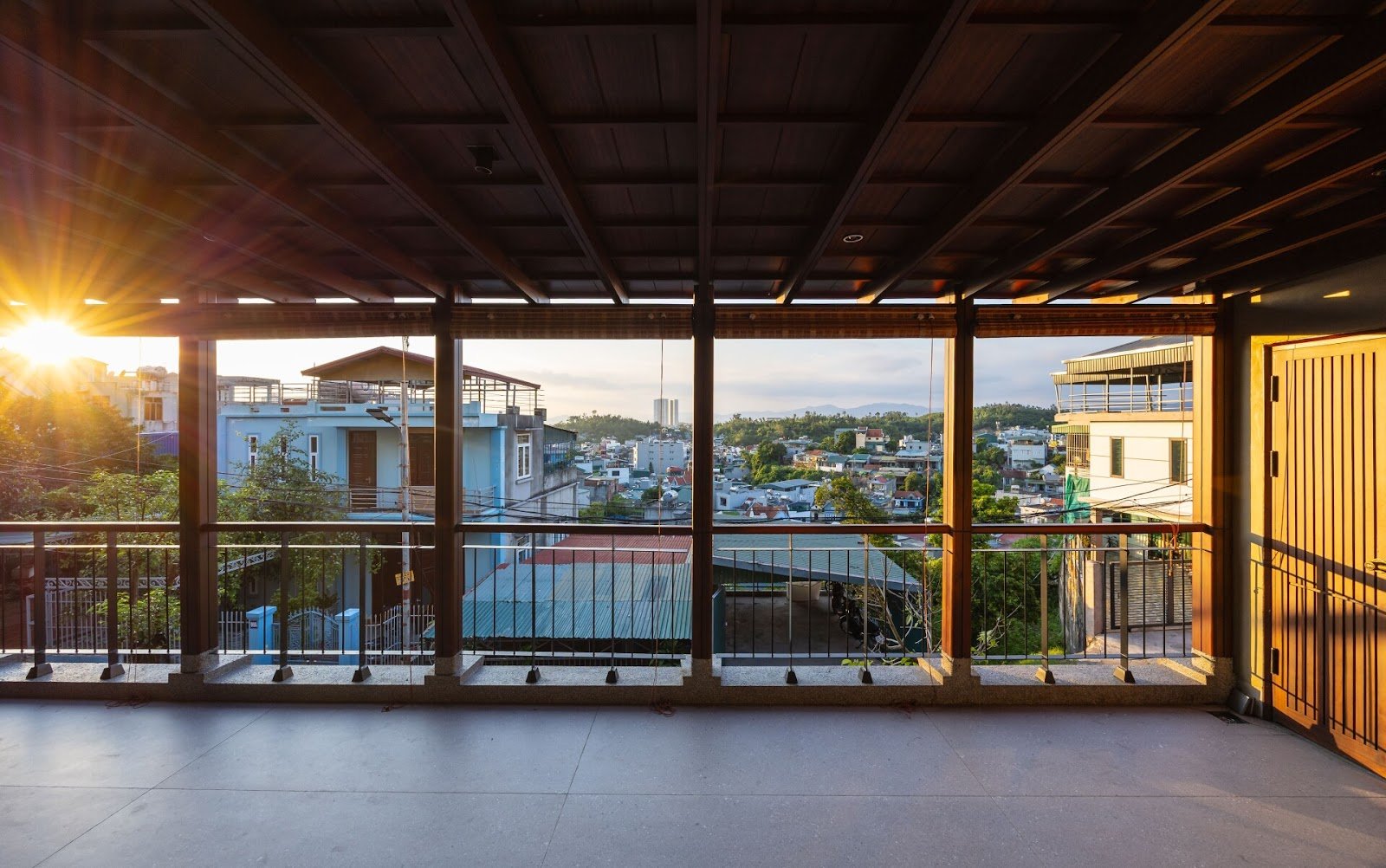 Từ hiên gỗ, gia chủ có thể ngắm trọn cảnh thành phố trong ánh hoàng hôn ấm áp. Hệ cửa kính trong suốt mang lại tầm nhìn rộng mở, tăng sự kết nối với thiên nhiên.