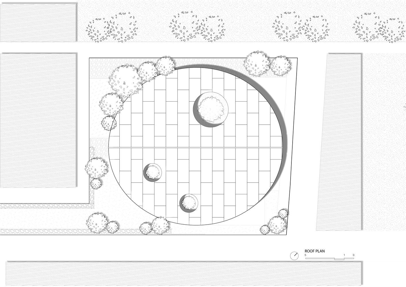 Hình khối mái cong ôm trọn sân trong, che chắn công trình trong bối cảnh đô thị. Những khoảng mở tròn đưa cây xanh và ánh sáng len sâu vào lõi ngôi nhà