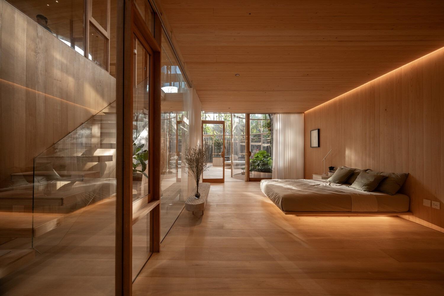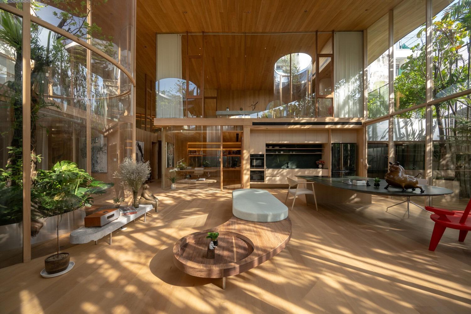 Không gian sinh hoạt xoay quanh sân trong trung tâm, mở rộng bằng hệ vách kính cong. Ánh sáng tự nhiên được dẫn dắt nhẹ nhàng vào nội thất gỗ ấm áp
