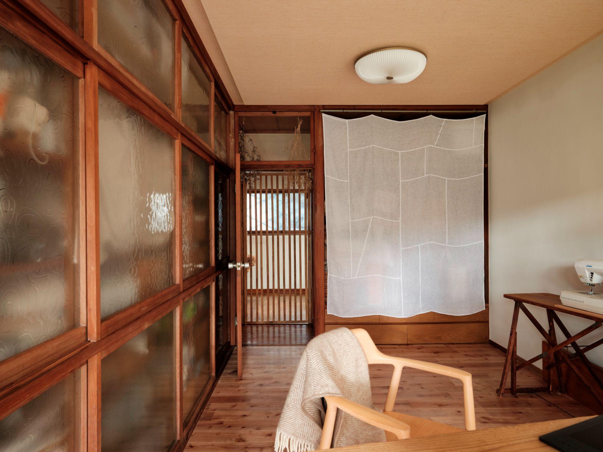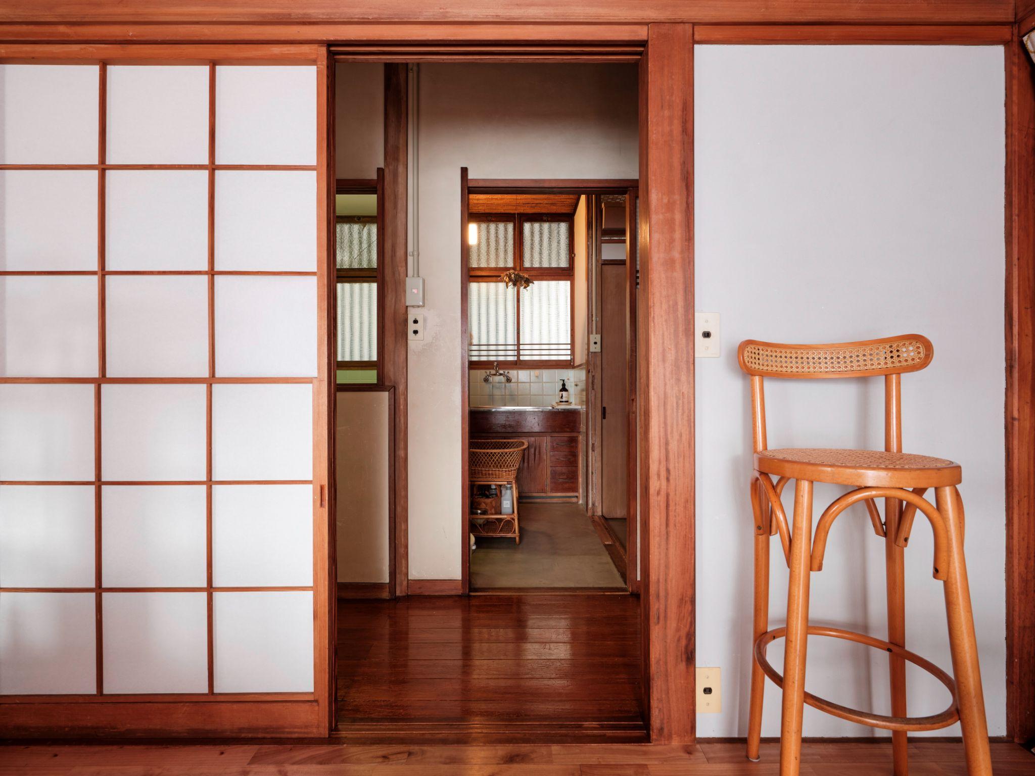Hệ cửa trượt shoji mở ra trục nhìn thẳng vào khu bếp phía sau, tạo chiều sâu cho không gian. Cách tổ chức này giúp các phòng liên kết bằng ánh nhìn thay vì tường kín, khiến ngôi nhà nhỏ trở nên thoáng hơn