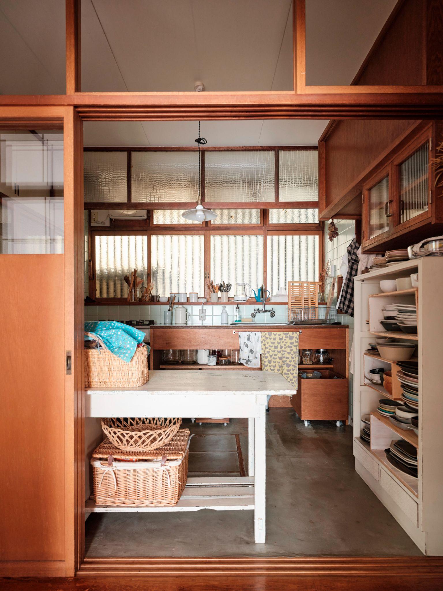 Góc nhìn vào bếp cho thấy bàn thao tác cũ được giữ lại và sử dụng như đảo bếp phụ. Việc tái sử dụng đồ nội thất cũ giúp tiết kiệm chi phí và duy trì cảm giác quen thuộc trong sinh hoạt hằng ngày