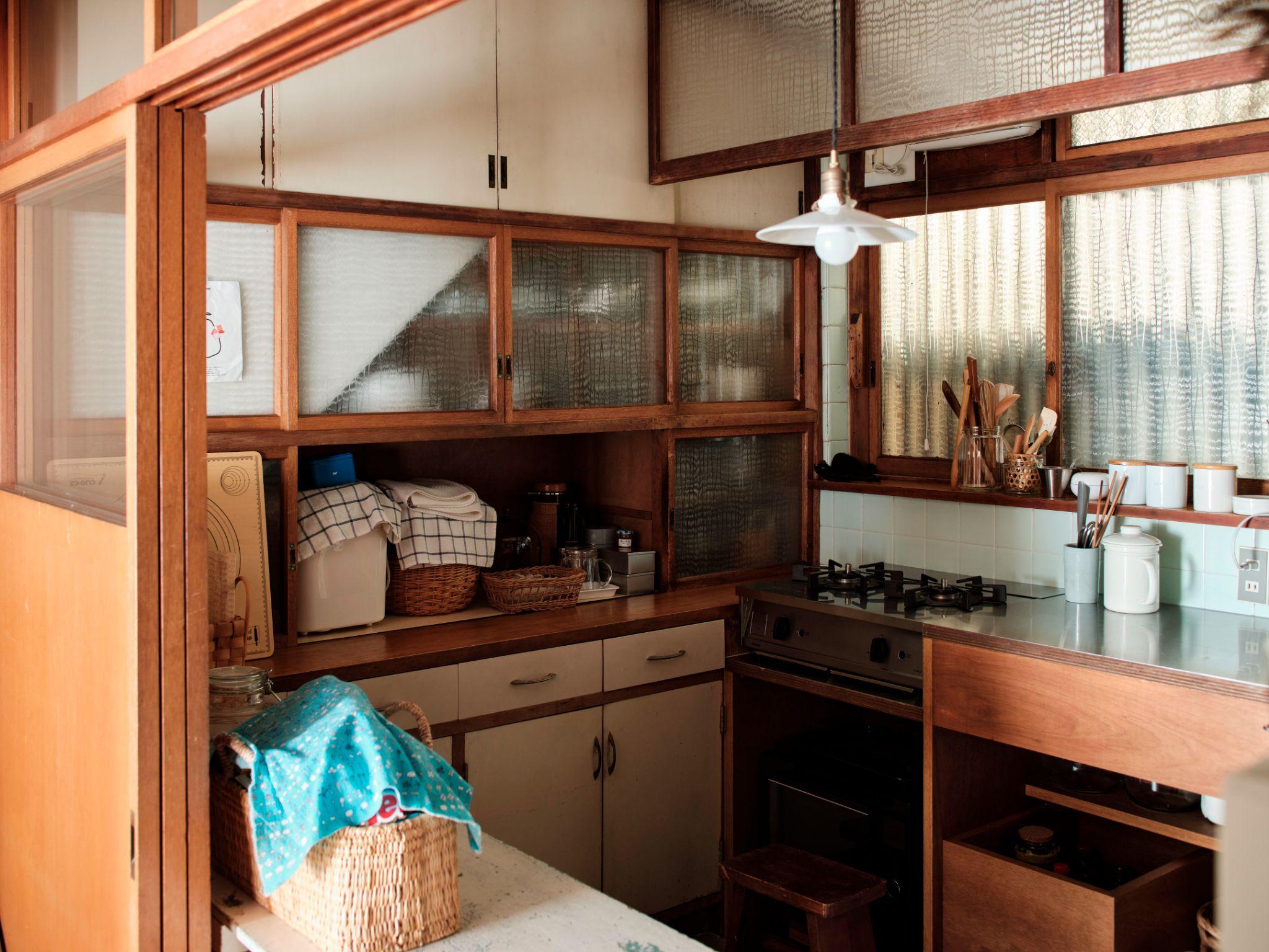 Hệ tủ bếp âm tường cũ được làm mới và tiếp tục sử dụng. Chỉ phần đã xuống cấp hoặc không còn phù hợp mới được thay thế bằng một quầy gỗ đơn giản, đặt đóng riêng.