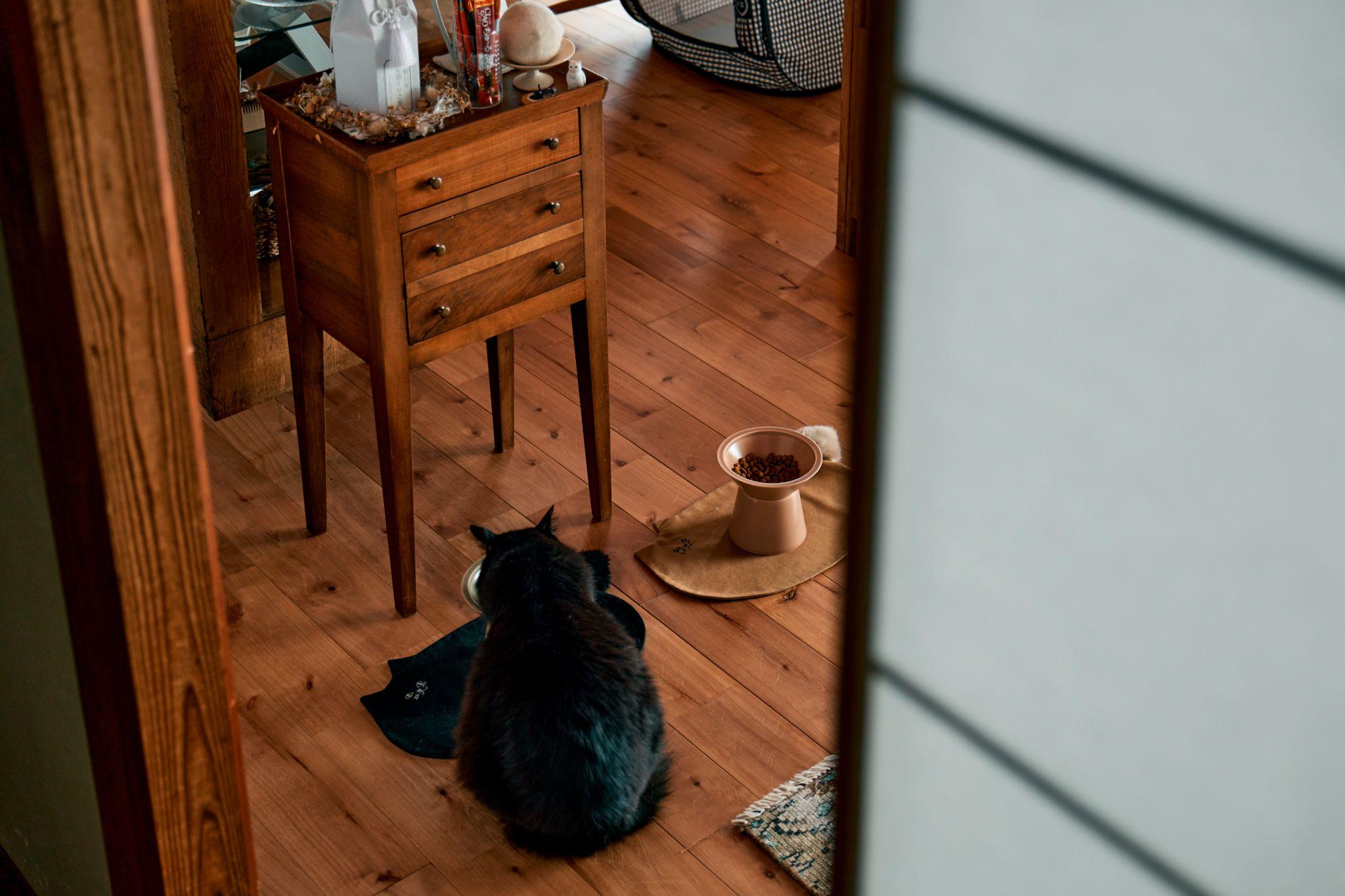 Góc nhỏ với tủ gỗ thấp và khu vực ăn uống dành riêng cho mèo, đặt ngay lối đi. Việc bố trí không gian cho thú cưng cho thấy ngôi nhà được thiết kế xoay quanh đời sống thực tế của người ở