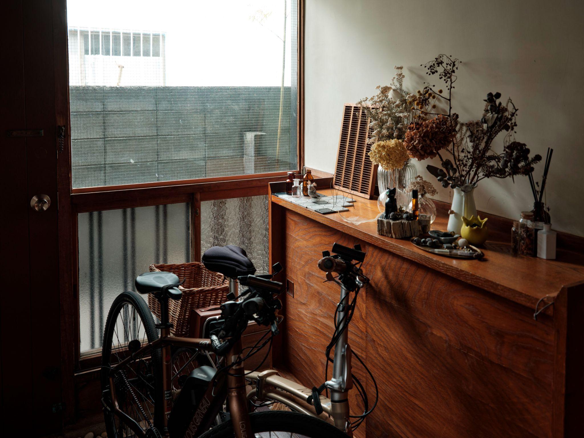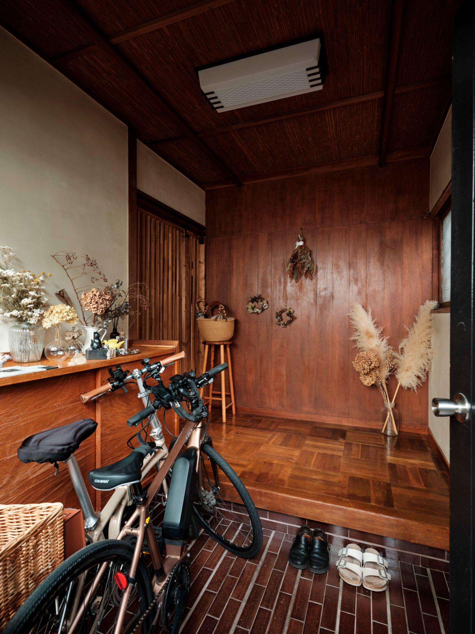 Một góc nhỏ gần cửa được tận dụng làm nơi để xe đạp và trưng bày đồ cá nhân. Giải pháp này biến khu vực phụ thành không gian sinh hoạt thực tế, phản ánh lối sống hằng ngày của gia chủ
