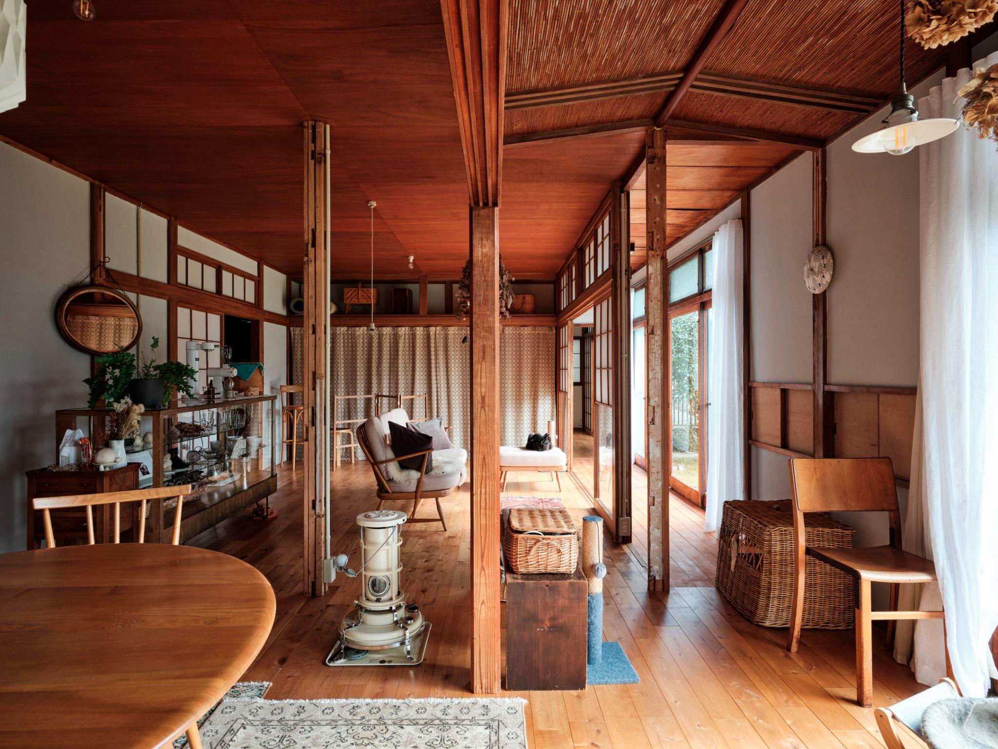 Không gian sinh hoạt chung sử dụng sàn gỗ, trần gỗ và cột gỗ nguyên bản, tạo cảm giác ấm áp và gần gũi. Việc giữ kết cấu cũ giúp ngôi nhà giữ được ký ức thời gian, đồng thời tạo nền trung tính cho đồ nội thất hiện đại