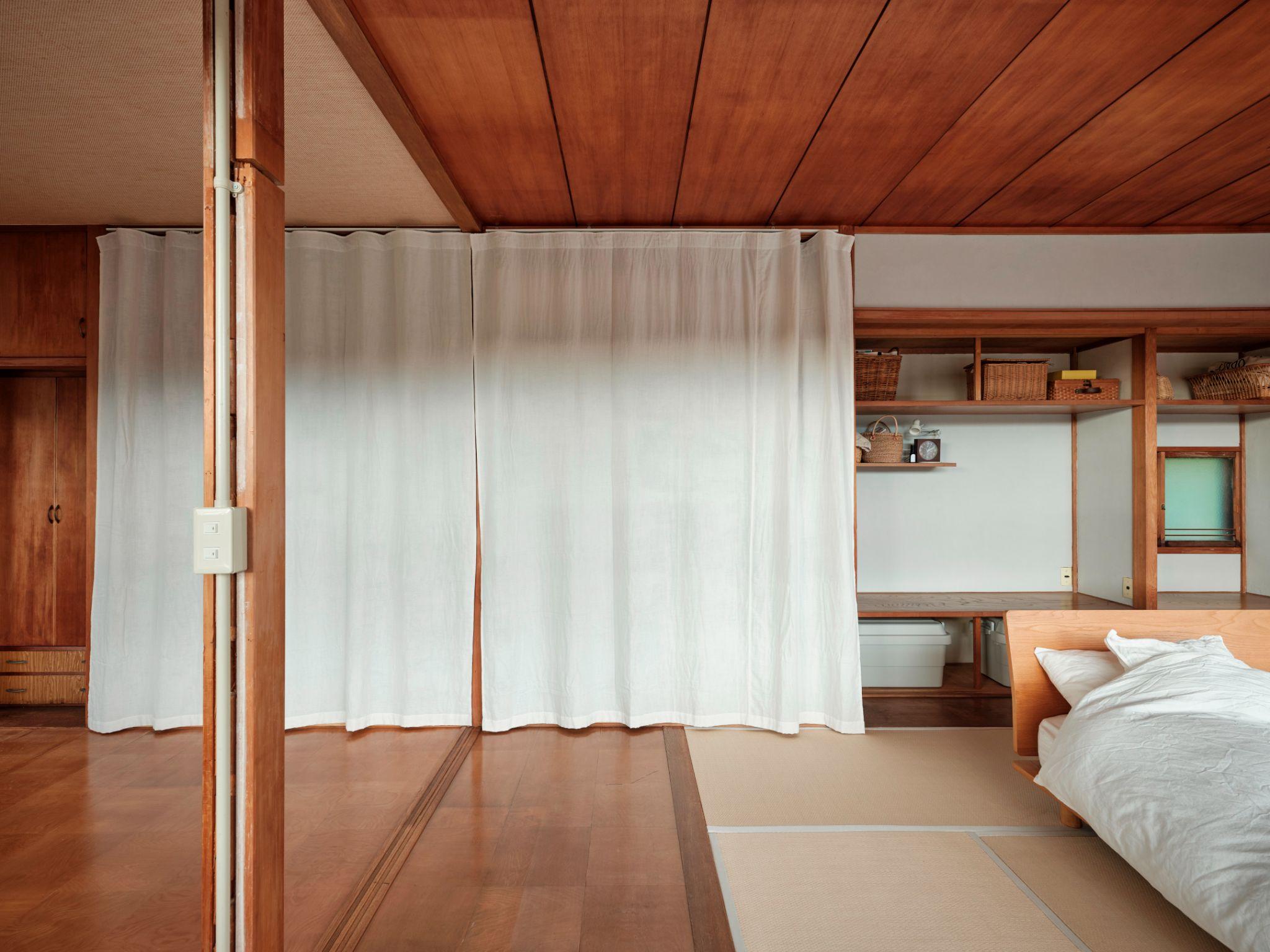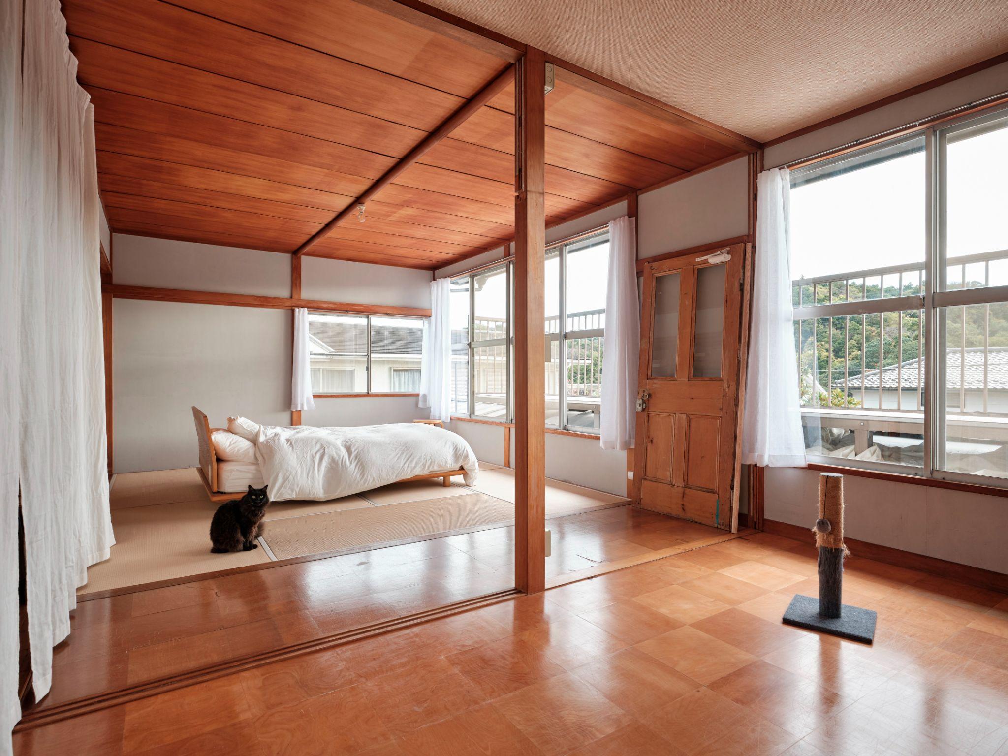 Phòng ngủ tầng trên được mở rộng từ 2 phòng nhỏ, với sàn tatami, giường thấp và ánh sáng tự nhiên tràn qua nhiều ô cửa sổ. Việc gộp không gian giúp phòng ngủ trở nên thoáng đãng, phù hợp cho sinh hoạt hằng ngày thay vì chỉ dùng để ngủ