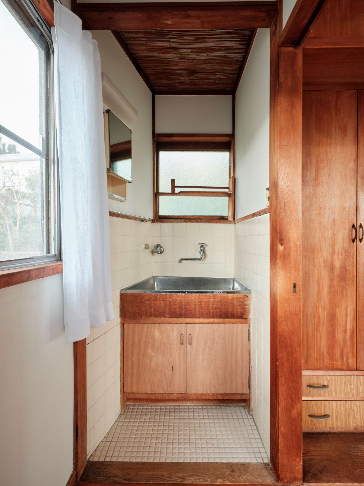 Thay vì cố “giả cũ”, cách làm này giúp sự khác biệt giữa các lớp thời gian trở nên rõ ràng và trung thực. Sàn phòng tắm vẫn sử dụng gạch tamaira nguyên bản, mang lại cảm giác bề mặt gồ ghề nhẹ, giàu chiều sâu và rất đặc trưng.