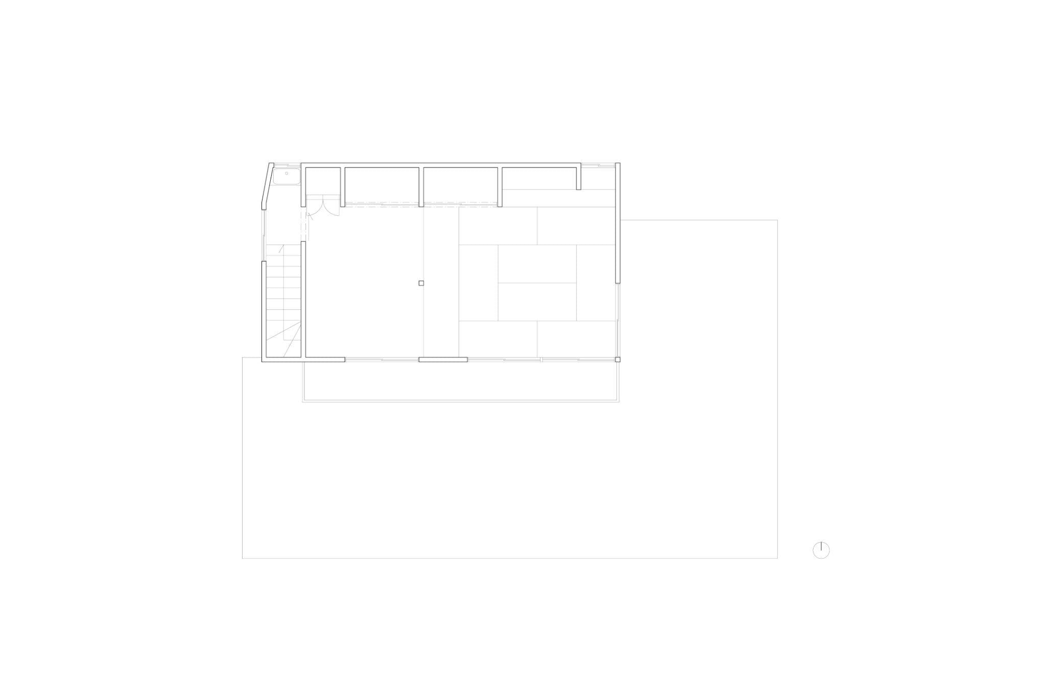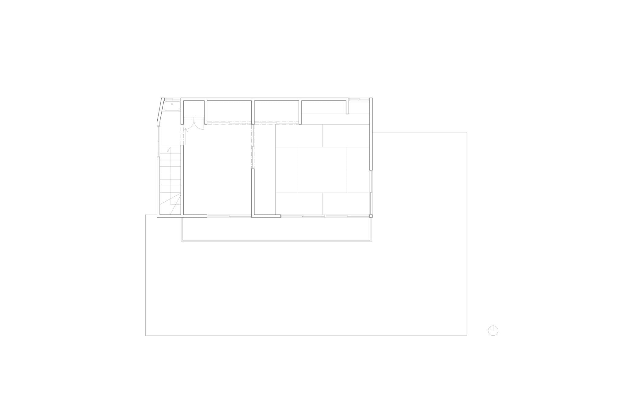 Mặt bằng tầng 2 thể hiện việc gộp hai phòng nhỏ thành một phòng ngủ lớn, với khu lưu trữ chạy dọc theo tường. Giải pháp này giúp không gian nghỉ ngơi trở nên thoáng hơn và giảm cảm giác chia cắt như bố cục cũ