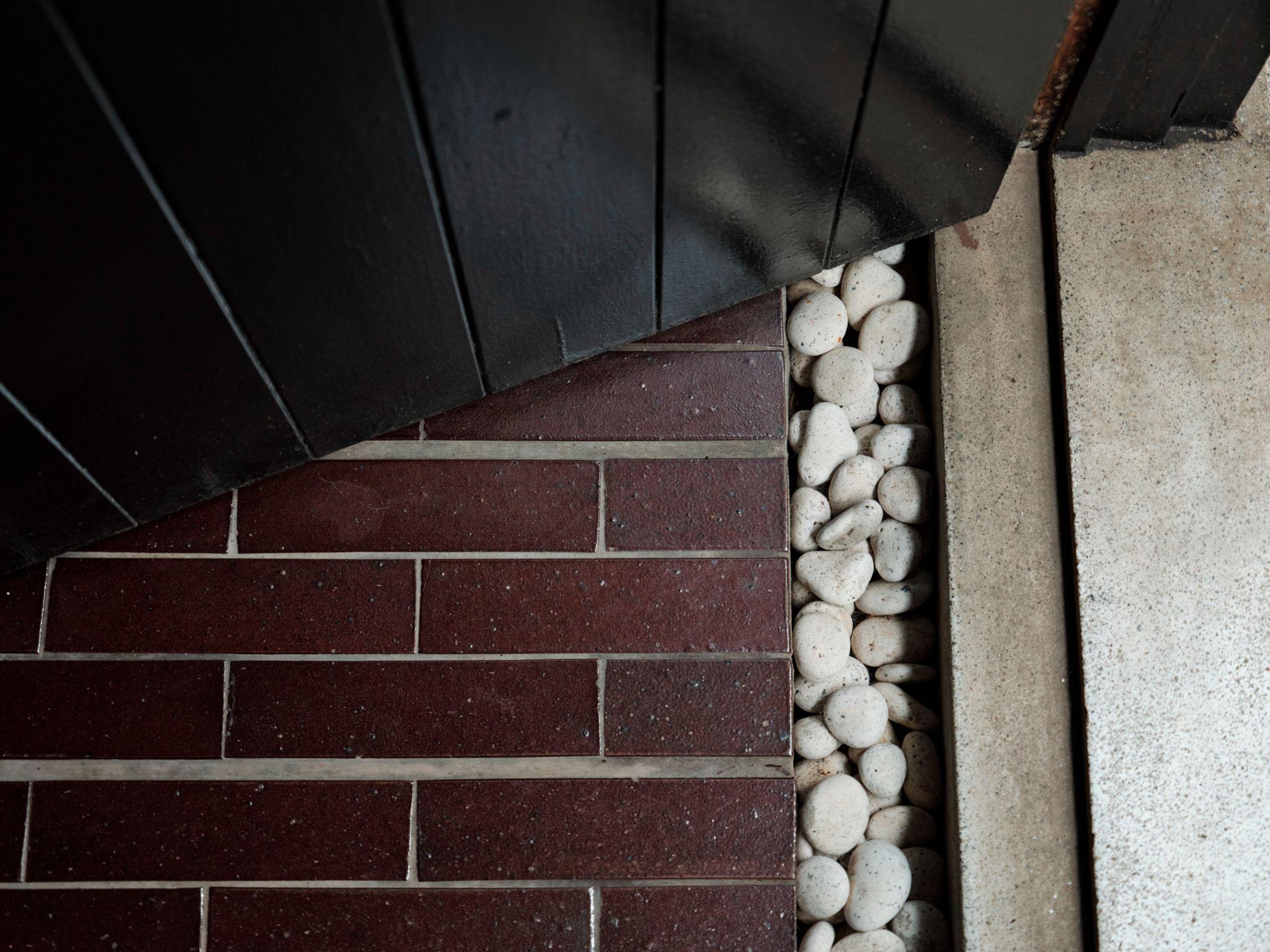 Cận cảnh chi tiết lối vào với nền gạch đỏ sẫm, bậc bê tông và dải sỏi trắng đặt giữa. Việc giữ nguyên chi tiết sỏi rời giúp tạo cảm giác chuyển tiếp mềm mại giữa trong và ngoài nhà, đồng thời lưu giữ dấu ấn thủ công của ngôi nhà cũ