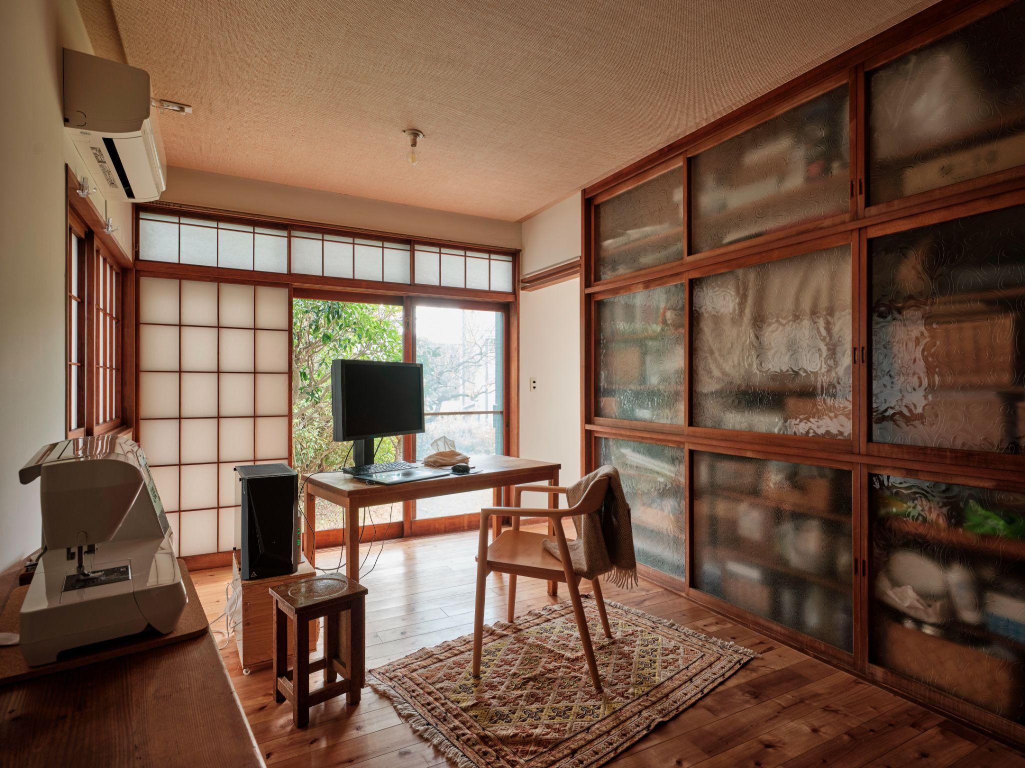 Phòng đầu tiên ở tầng trệt được chuyển thành không gian làm việc và studio. Điểm đáng chú ý là hệ cửa trượt kính - vốn thuộc về tủ âm tường cũ - không bị tháo bỏ mà được sửa chữa và sử dụng lại.