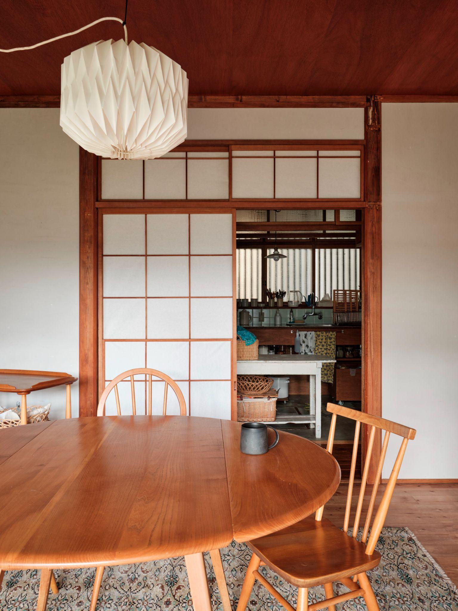 Khu vực bàn ăn sử dụng bàn ghế gỗ đơn giản, đặt dưới đèn thả ánh sáng dịu để tạo cảm giác ấm cúng. Việc giữ cửa trượt shoji phía sau giúp không gian ăn uống luôn linh hoạt, có thể mở rộng hoặc khép kín tùy nhu cầu