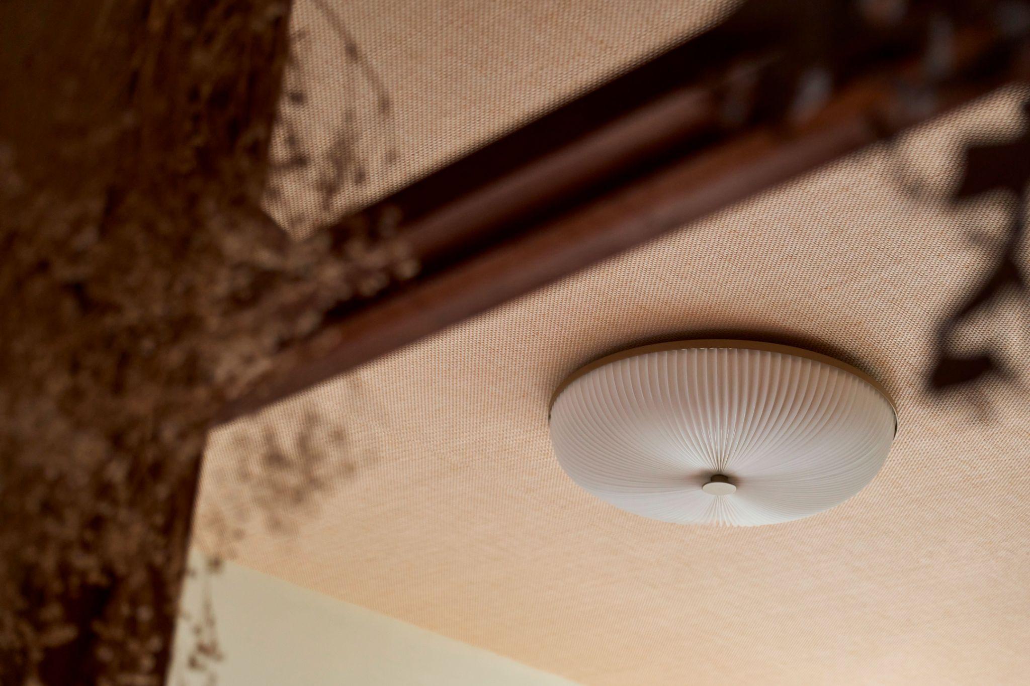 Đèn trần dạng phẳng được gắn trực tiếp lên trần vải, tạo ánh sáng dịu và đồng đều. Cách chiếu sáng này phù hợp với nhà cũ, không làm nổi bật khuyết điểm của trần theo thời gian