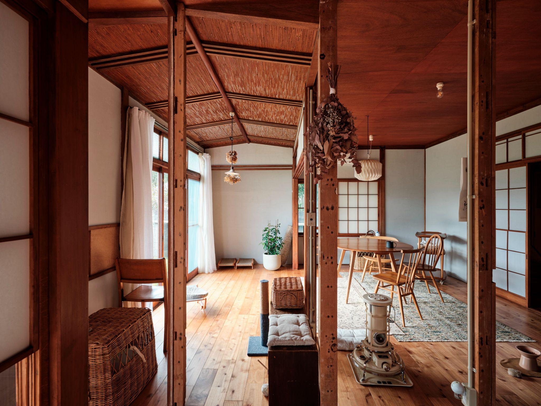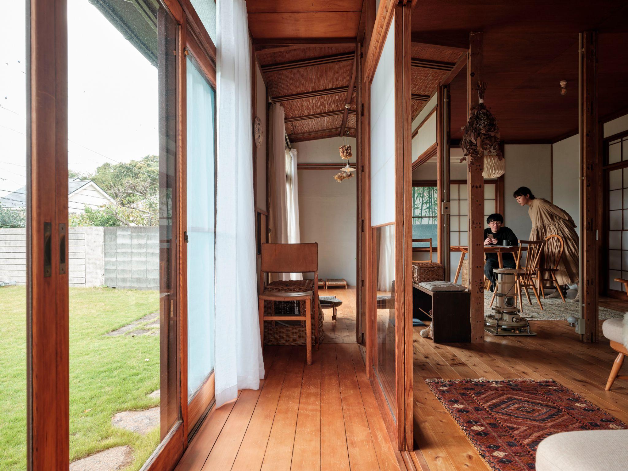 Dọc theo hành lang engawa - một đặc trưng quen thuộc trong nhà Nhật - các vách shoji và trần gỗ cũ được giữ lại gần như nguyên vẹn. Những phần trần mới, nơi các không gian được kết nối sau cải tạo, được hoàn thiện bằng gỗ mới với màu sắc và bề mặt tương đồng.