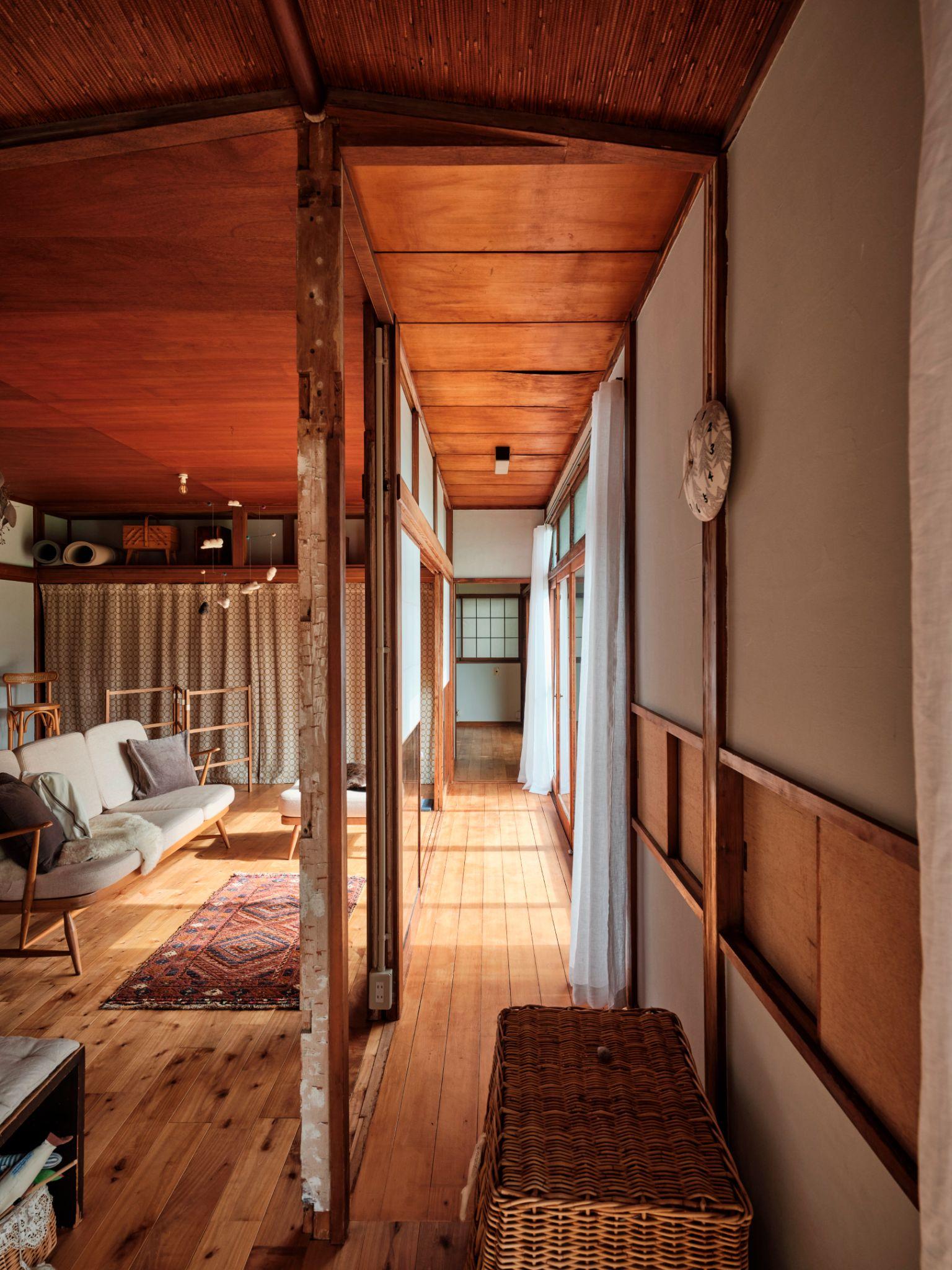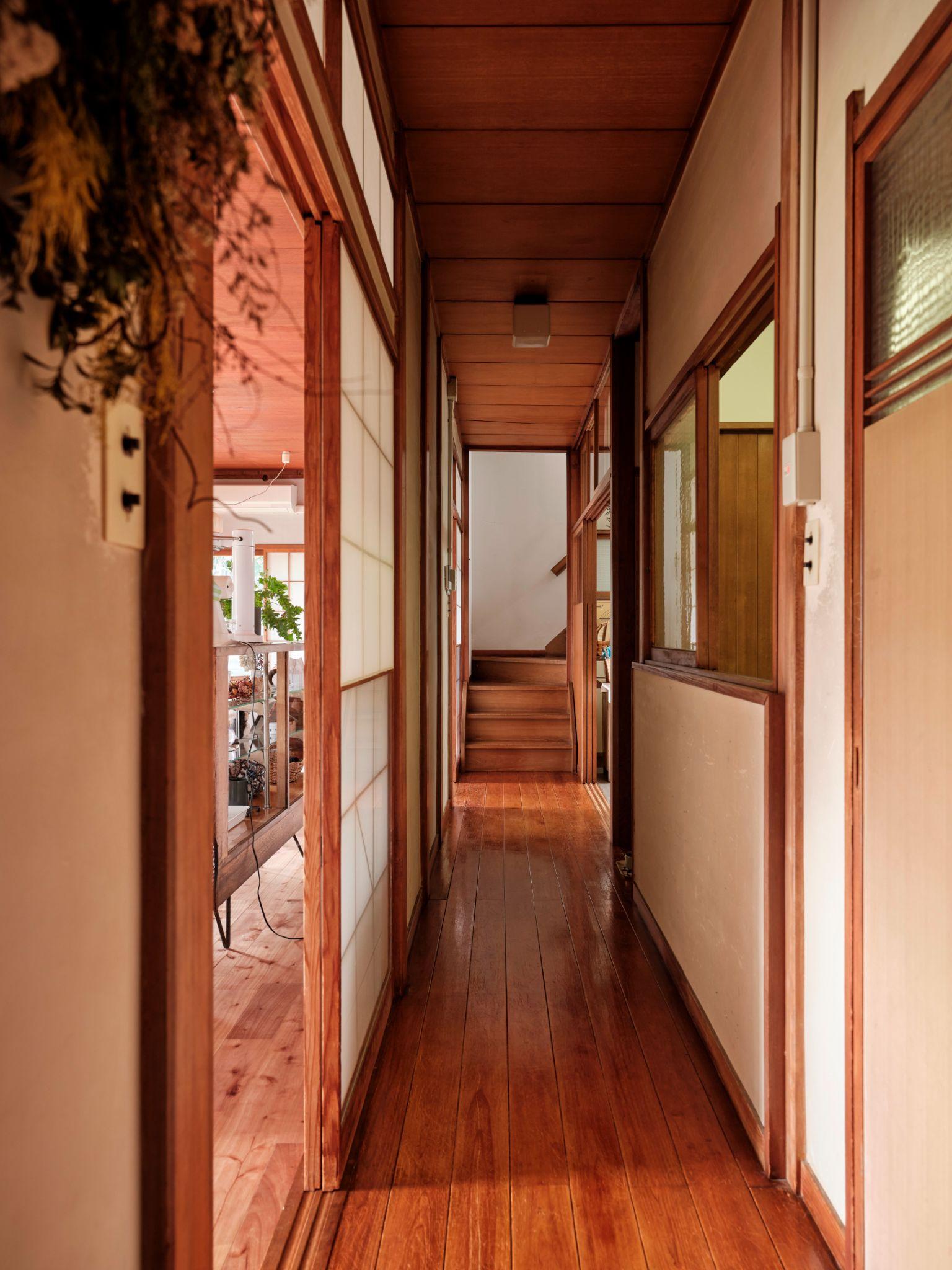 Hành lang gỗ chạy dọc ngôi nhà kết nối các không gian sinh hoạt, với trần và sàn gỗ giữ nguyên từ kết cấu cũ. Giải pháp duy trì hành lang dài giúp ánh sáng và gió lưu thông tự nhiên, đồng thời giữ nhịp di chuyển quen thuộc của nhà Nhật truyền thống