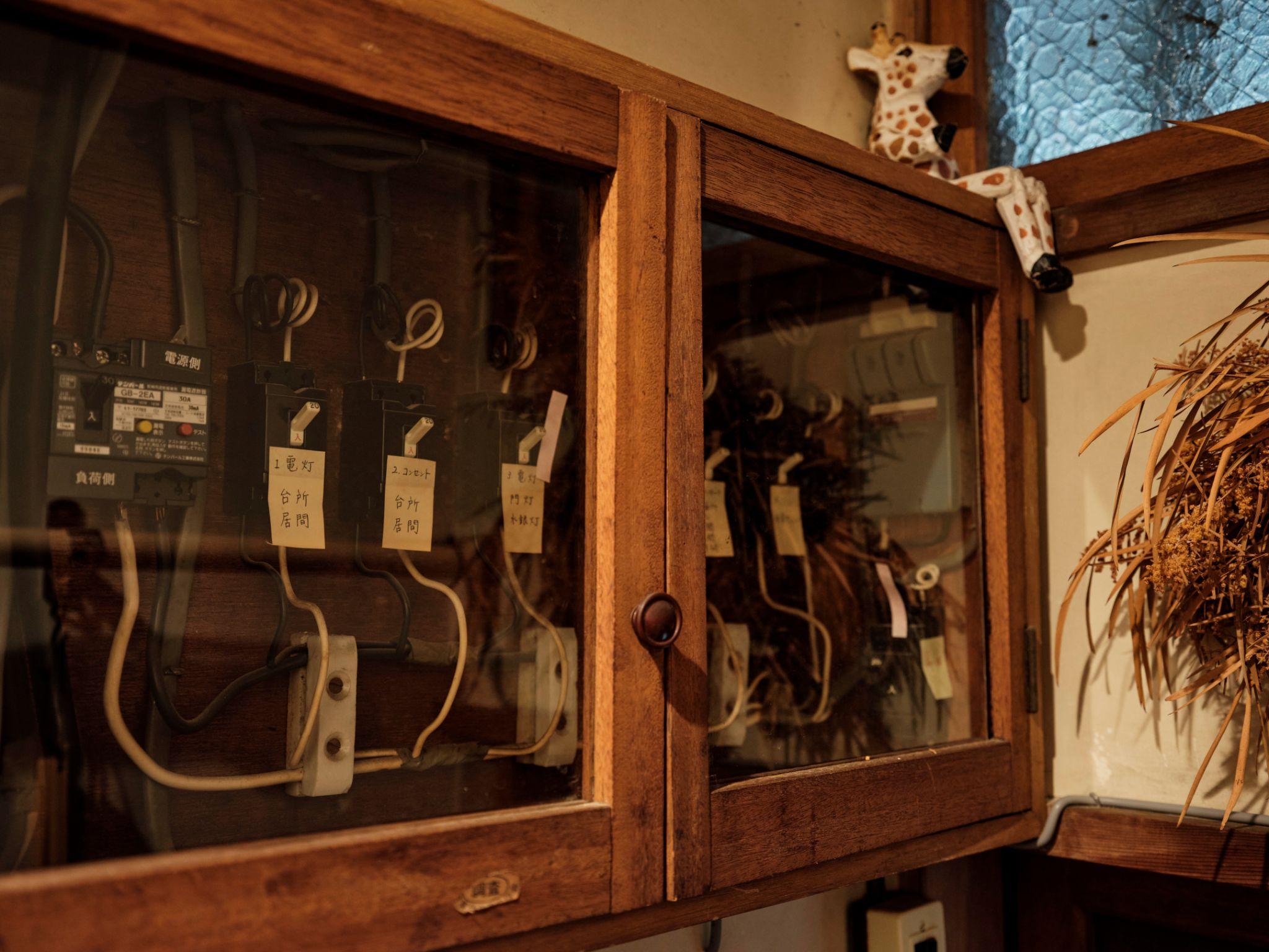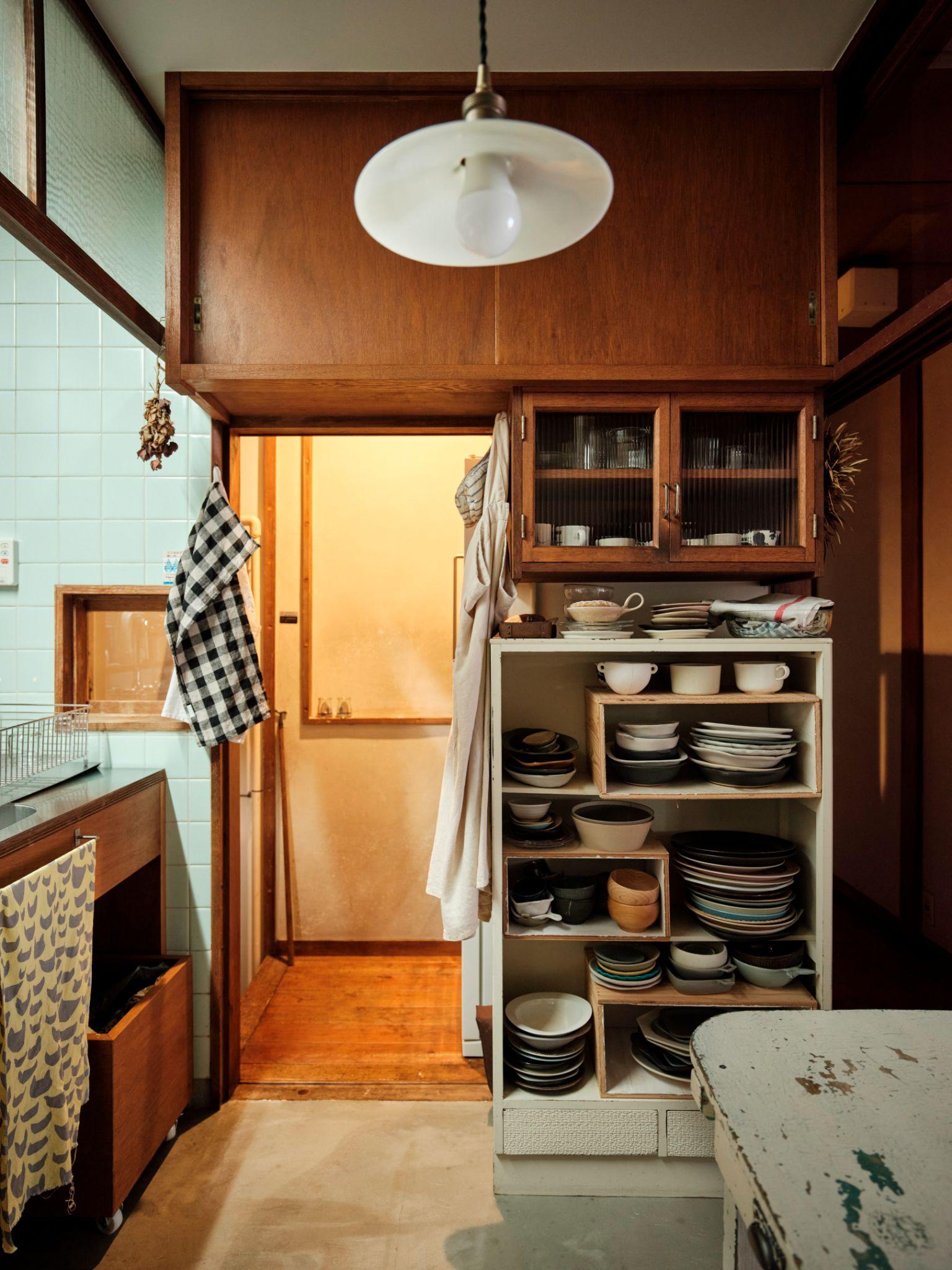 Tủ kính cong trưng bày đồ thủy tinh và bát đĩa được đặt sát cửa trượt shoji. Việc sử dụng tủ kính giúp đồ dùng luôn trong tầm mắt, khuyến khích sử dụng hằng ngày thay vì cất giấu