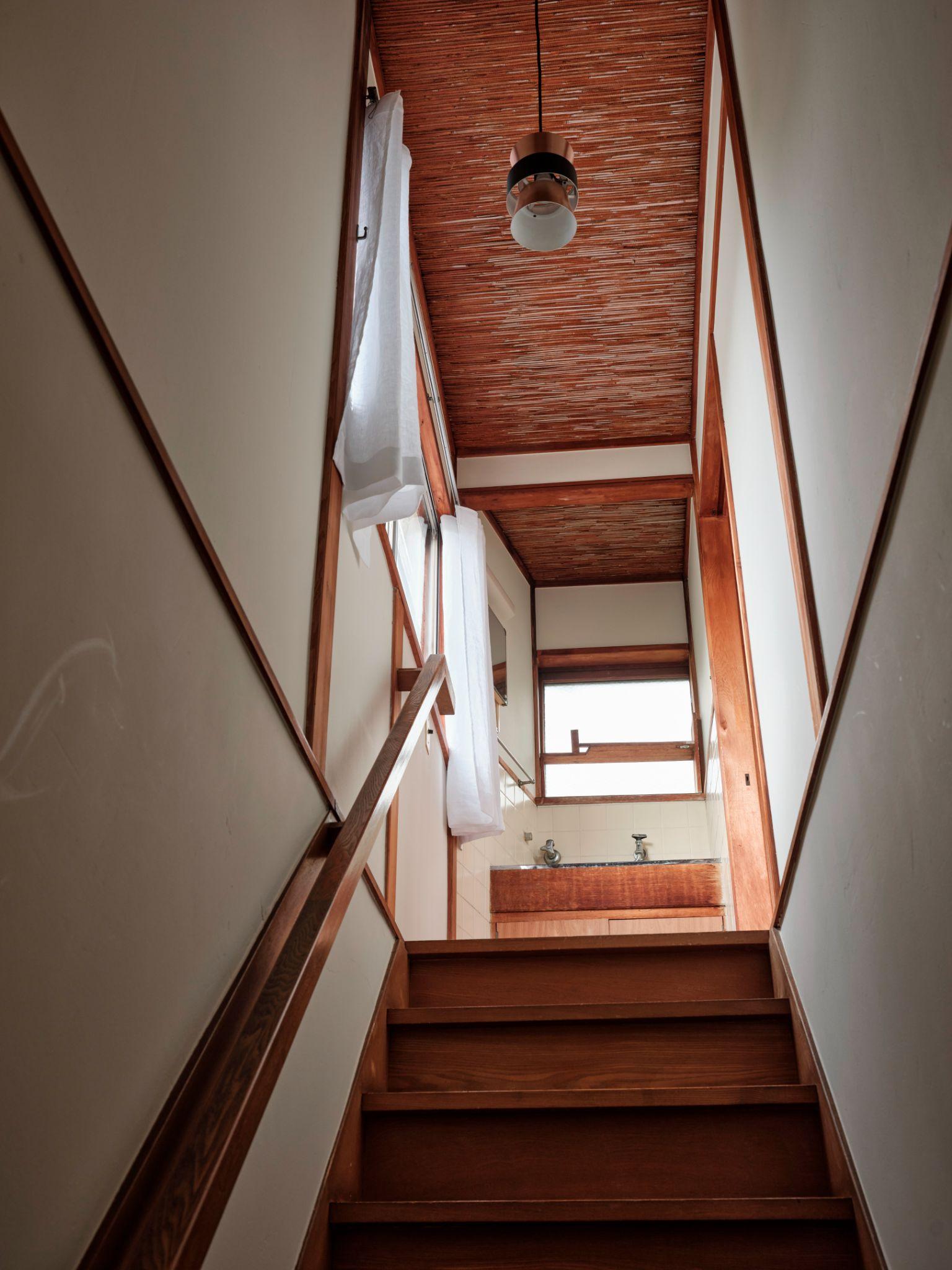 Cầu thang gỗ dẫn lên tầng trên với trần tre và cửa sổ lấy sáng tự nhiên. Việc giữ nguyên hình thức cầu thang cũ giúp duy trì nhịp di chuyển quen thuộc và cảm giác ấm áp khi lên xuống mỗi ngày
