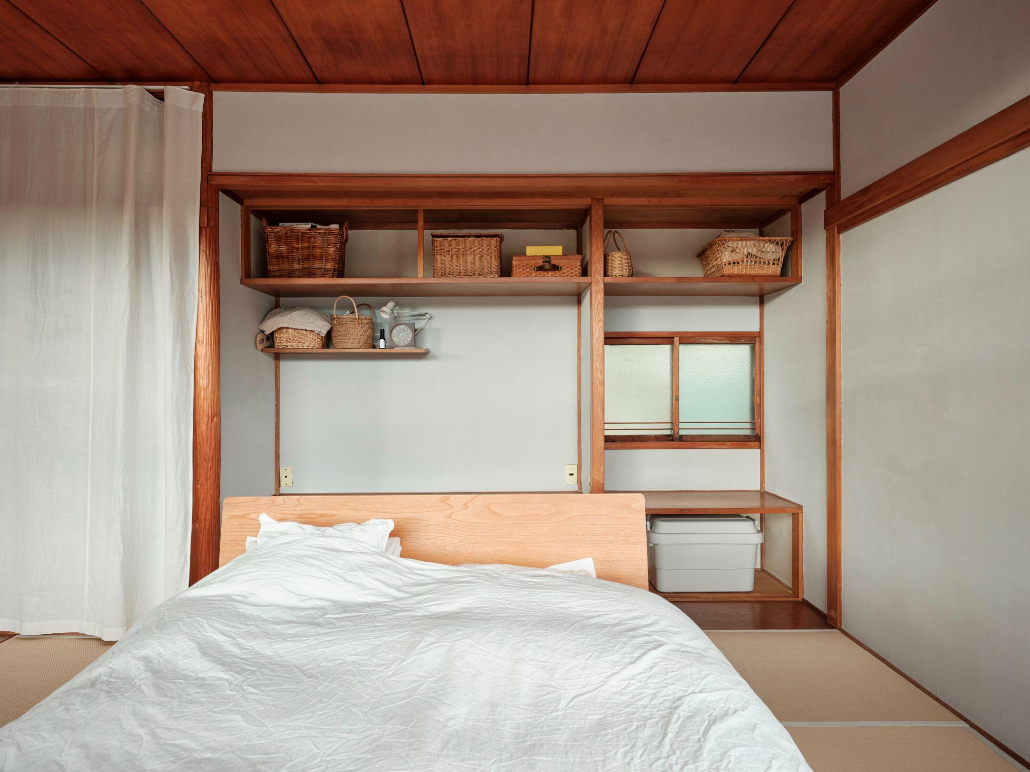 Tủ oshiire cũ của mỗi phòng được kết hợp thành một hệ lưu trữ dài, đủ dùng cho sinh hoạt hằng ngày mà không cần bổ sung thêm tủ mới. Cách tổ chức này giữ được tinh thần nhà Nhật truyền thống, đồng thời phù hợp với lối sống tối giản của gia chủ.