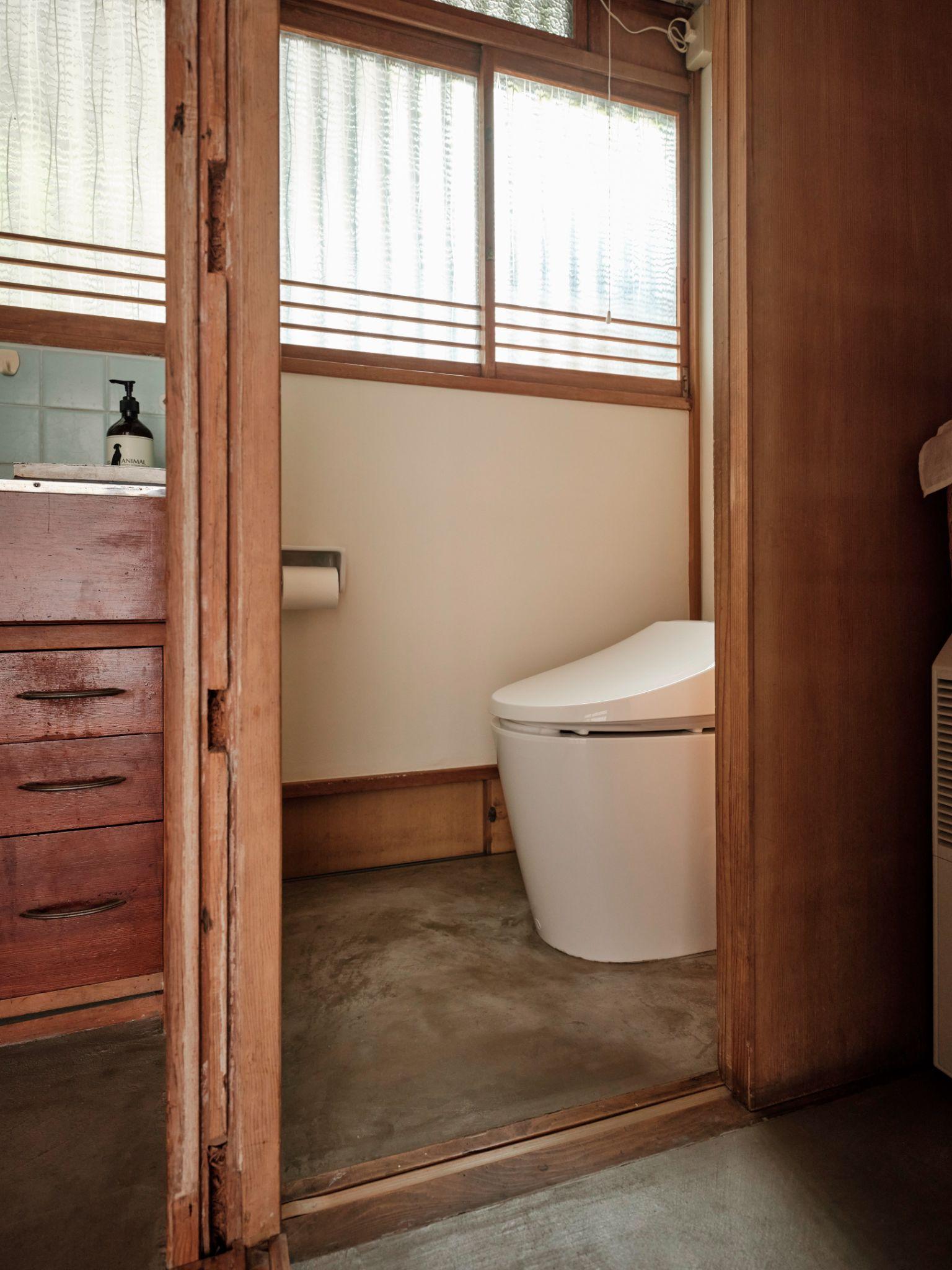 Không gian vệ sinh nhỏ được cải tạo gọn gàng với bồn cầu hiện đại đặt trên nền bê tông mộc. Cách xử lý tối giản giúp đảm bảo tiện nghi mới mà không phá vỡ tinh thần nhà gỗ truyền thống