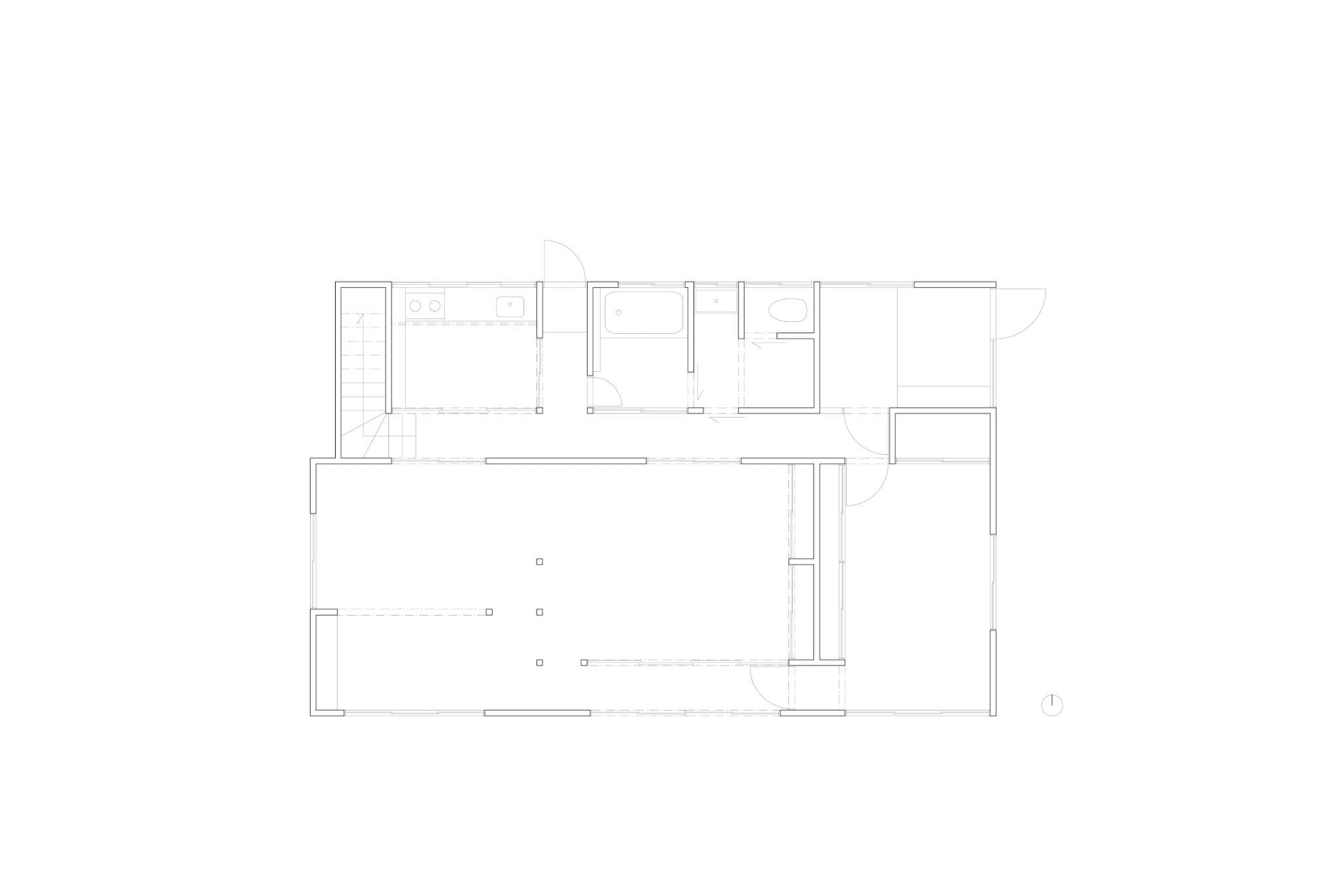Bản vẽ mặt bằng tầng trệt trước cải tạo cho thấy nhiều phòng nhỏ, phân chia rõ ràng và ít liên kết với nhau. Đây là bố cục phổ biến của nhà gỗ Nhật Bản cũ, nhưng không còn phù hợp với lối sống hiện đại