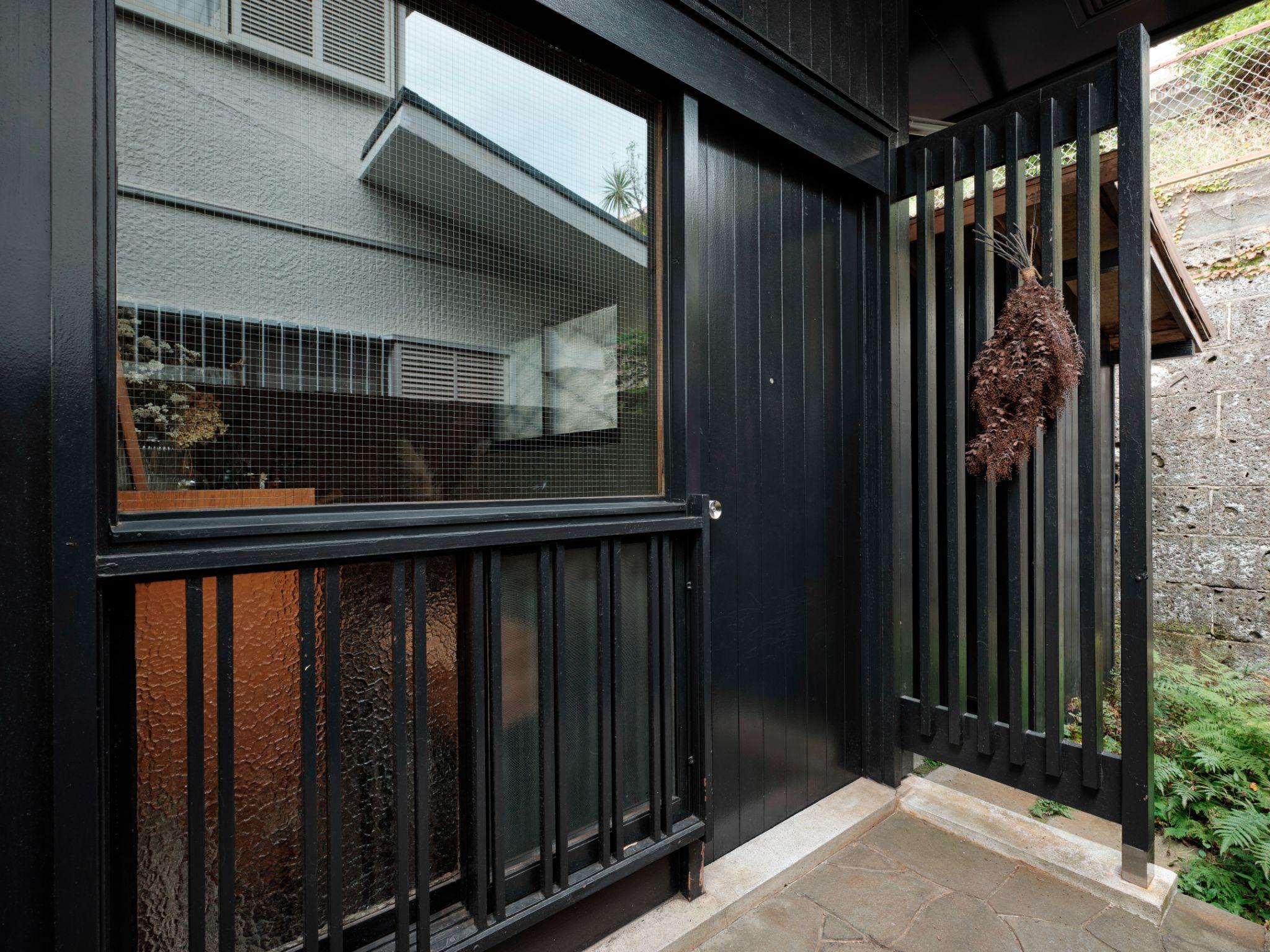 Cửa vào nhà sơn đen kết hợp với khung gỗ và song đứng tạo cảm giác chắc chắn, trầm lắng. Việc thống nhất màu sắc mặt tiền giúp ngôi nhà cũ có diện mạo gọn gàng mà không đánh mất bản sắc ban đầu