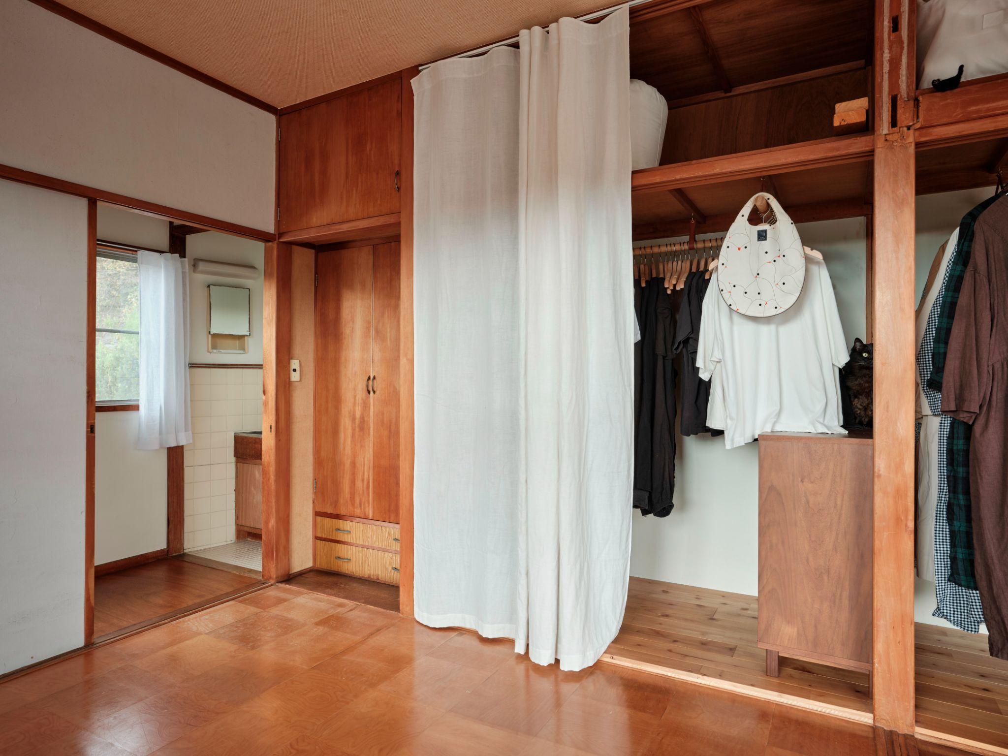 Khu tủ quần áo được giữ nguyên cấu trúc cũ, chỉ thay đổi cách sắp xếp và bổ sung rèm che. Việc không xây mới giúp tiết kiệm chi phí và vẫn giữ được cảm giác quen thuộc của ngôi nhà gỗ lâu năm
