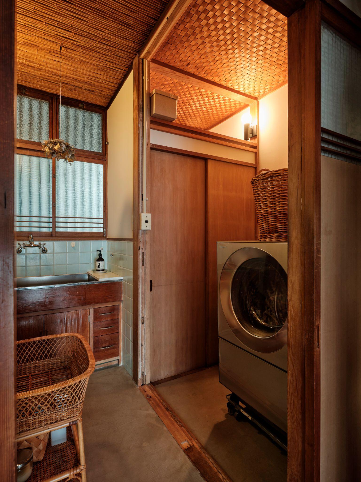 Khu giặt đồ được đặt gọn trong không gian phụ, với máy giặt hiện đại kết hợp tủ gỗ cũ và trần tre đan. Giải pháp giữ nguyên cấu trúc giúp khu vực kỹ thuật vẫn hài hòa với tổng thể nhà ở