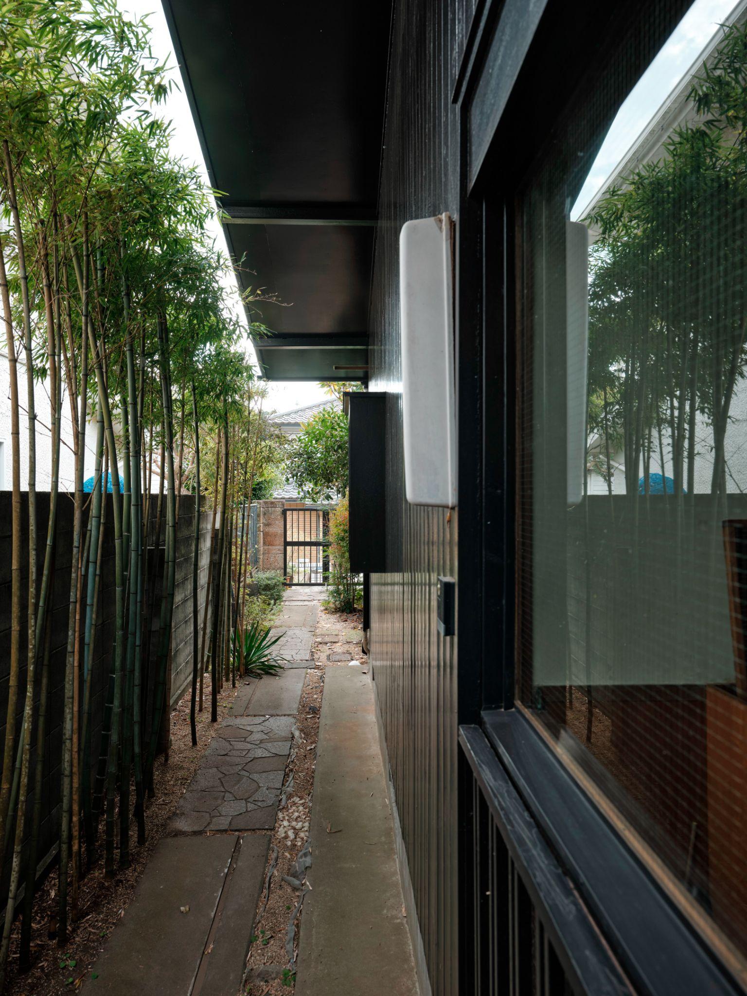 Lối đi bên hông nhà được bao bọc bởi hàng tre và tường thấp, tạo cảm giác kín đáo và yên tĩnh. Đây là giải pháp cảnh quan đơn giản nhưng hiệu quả, giúp ngôi nhà tách khỏi nhịp sống bên ngoài