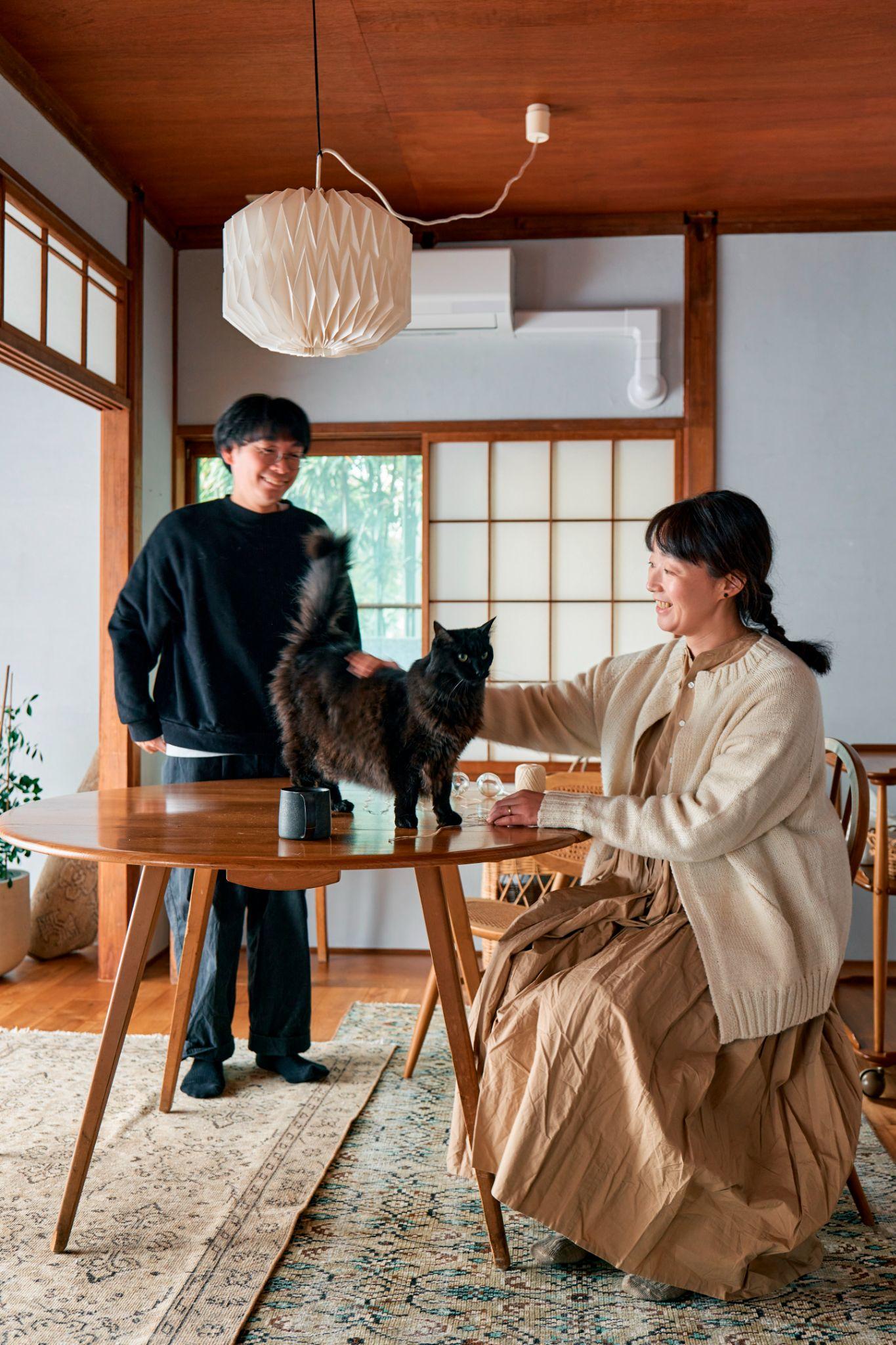 Không gian ăn uống nơi gia chủ tương tác cùng mèo, với bàn gỗ tròn và đèn treo nhẹ nhàng phía trên. Cách sắp xếp này tạo cảm giác ấm cúng, giúp bữa ăn trở thành một phần gắn kết của đời sống gia đình